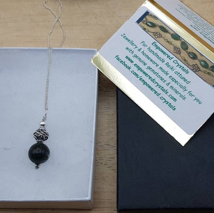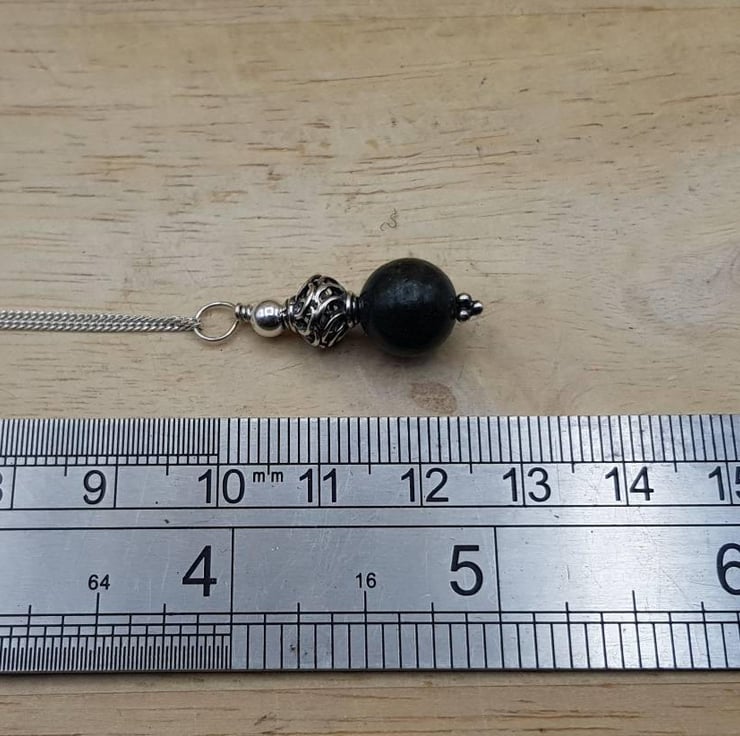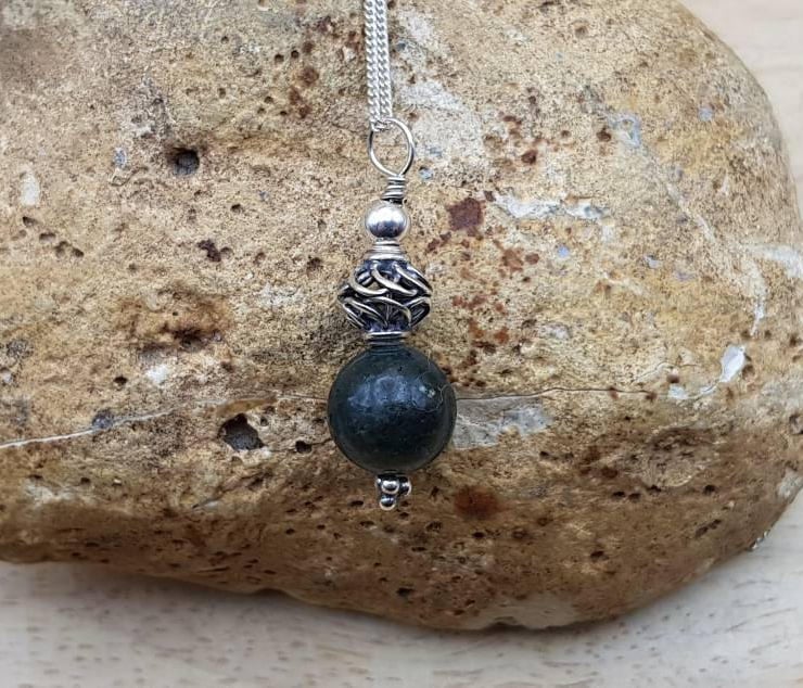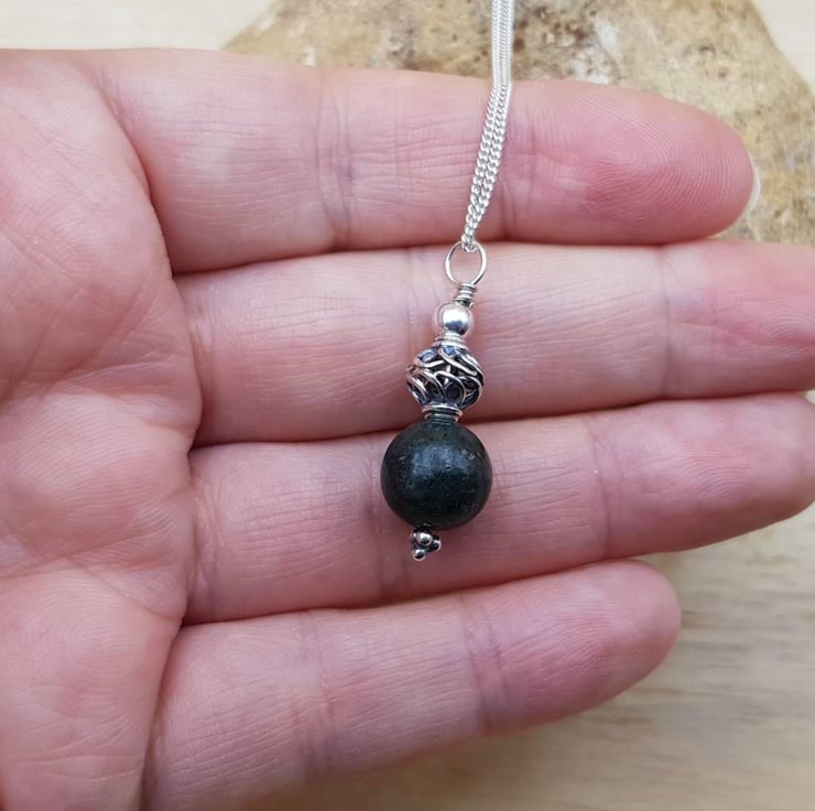 This is a small delicate dark green / black Astrophyllite pendant made with Bali silver beads which are handmade beads by the world renown silversmiths of Bali that contain up 99% silver. Bali Silver is not hallmarked or stamped.