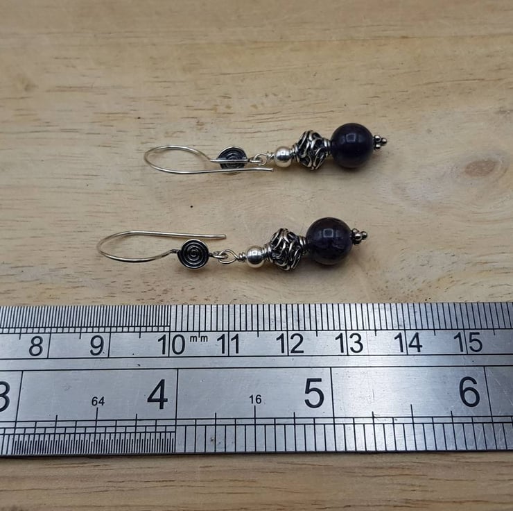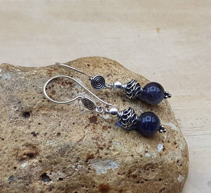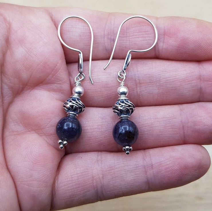 These are Bali silver Iolite earrings made with Bali Silver beads which are handmade beads by the world renown silversmiths of Bali that contain up to 99% silver. Bali Silver is not hallmarked or stamped.
