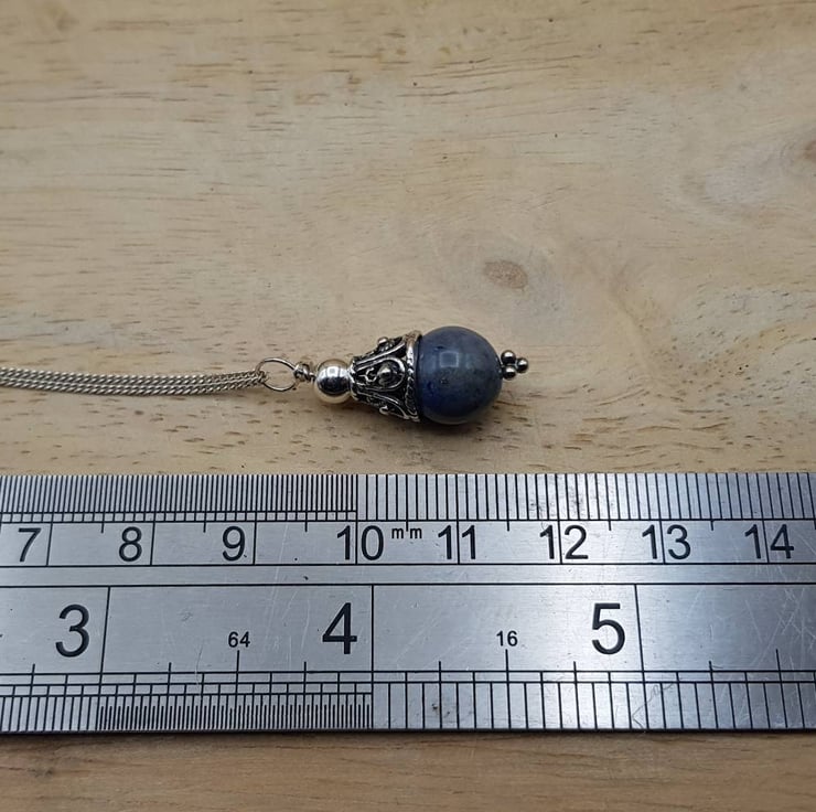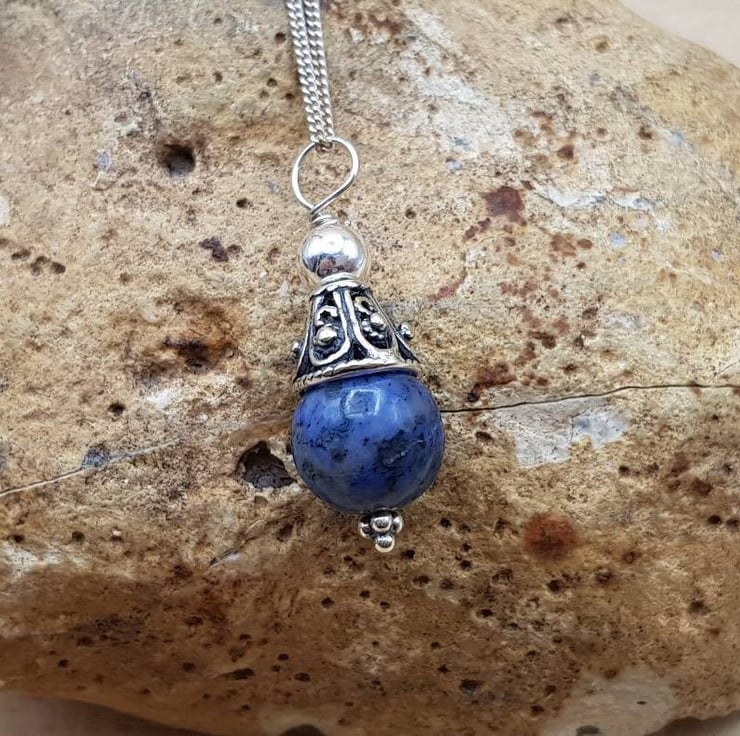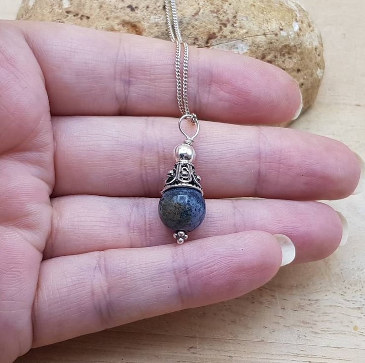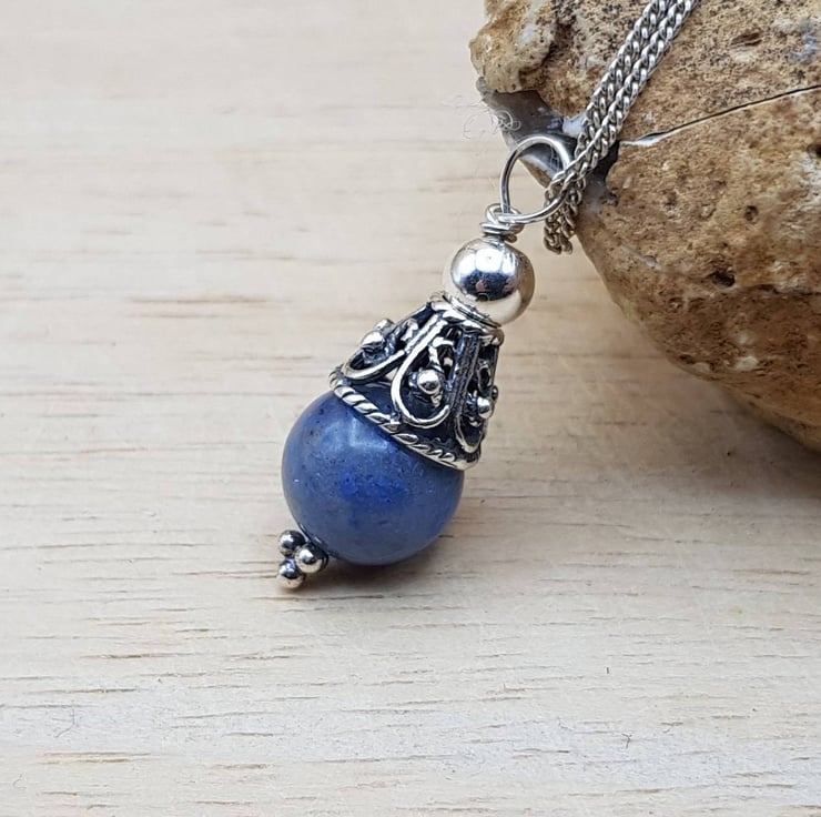 This is a Bali silver dark blue dumortierite pendant necklace. Bali silver beads are handmade by the renown silversmiths of Bali and are up to 99% silver. Bali Silver is not stamped or hallmarked.