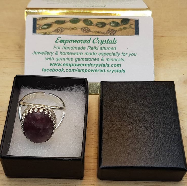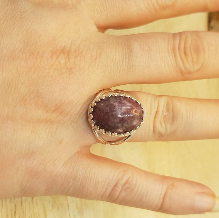This is a women's simple oval sterling silver purple Lepidolite adjustable ring with crown edging. Stones will vary from the photos.