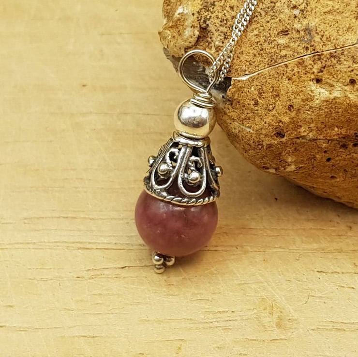 This is a small, delicate Bali silver Rhodonite cone pendant necklace, made with Bali silver beads which are handmade beads by the world renown silversmiths of Bali and contain up to 99% silver. Bali silver is not hallmarked or stamped.