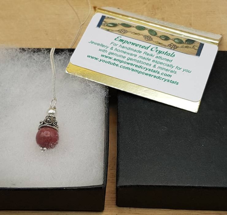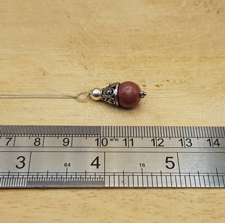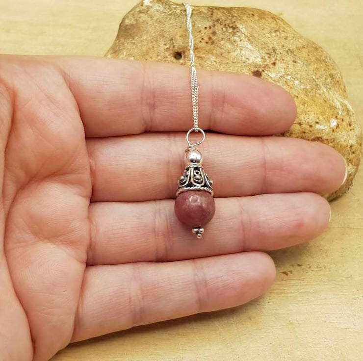 This is a small, delicate Bali silver Rhodonite cone pendant necklace, made with Bali silver beads which are handmade beads by the world renown silversmiths of Bali and contain up to 99% silver. Bali silver is not hallmarked or stamped.