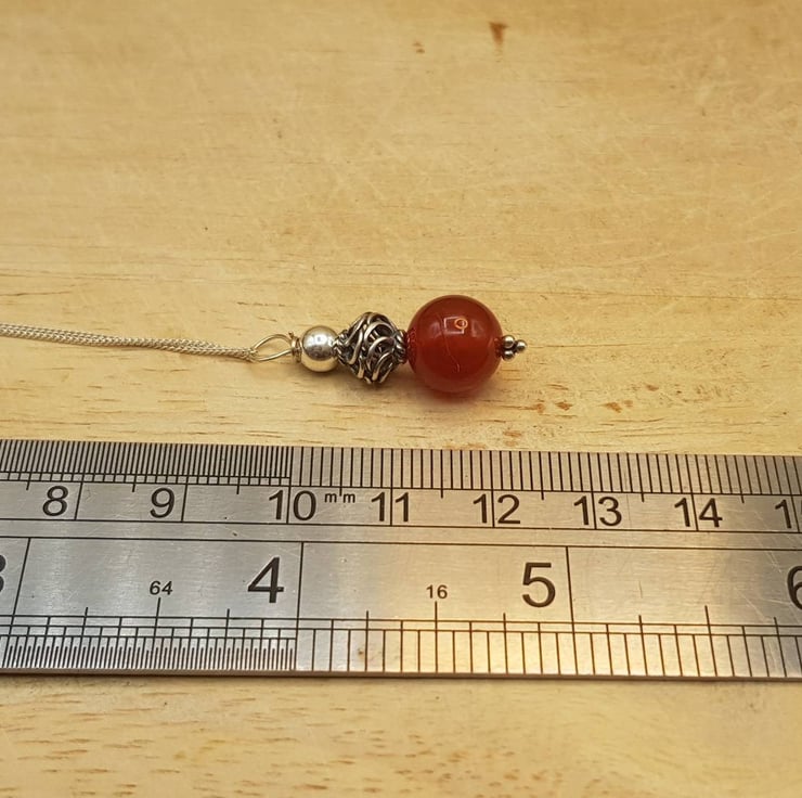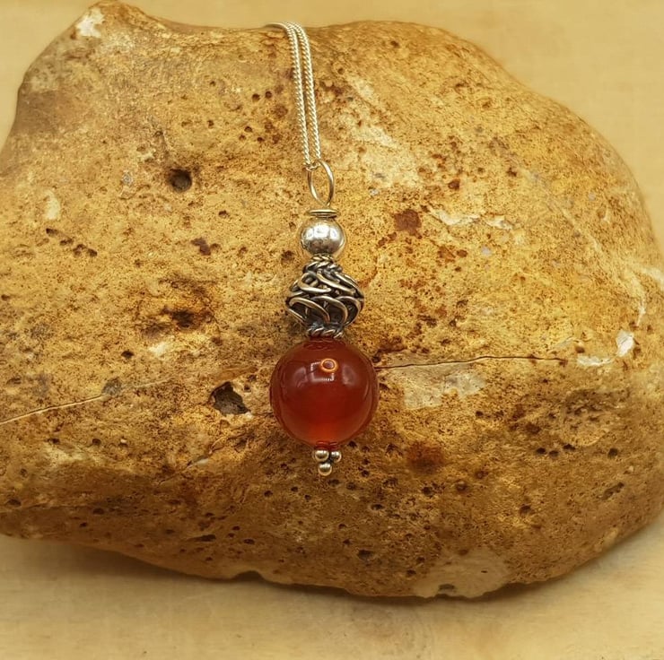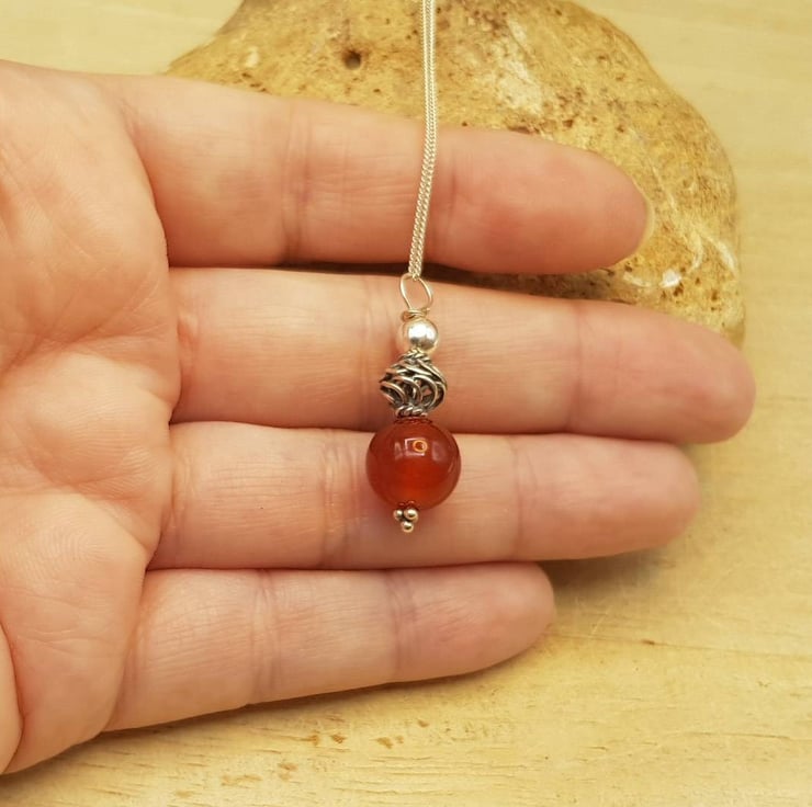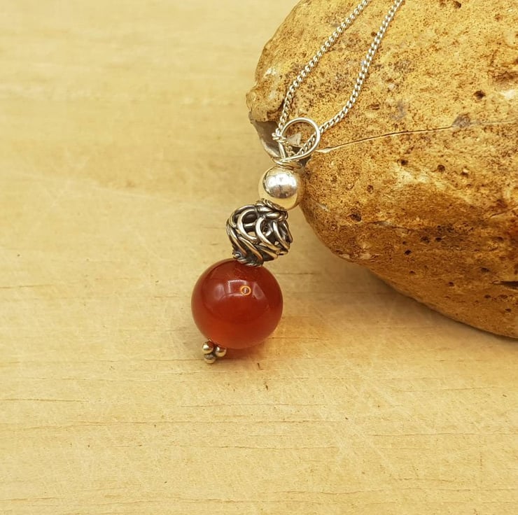 This is a women's minimalist Bali silver Carnelian sphere pendant. Bali Silver beads are handmade beads by the world renown silversmiths of Bali that contain up to 99% silver. Bali Silver is not hallmarked or stamped.