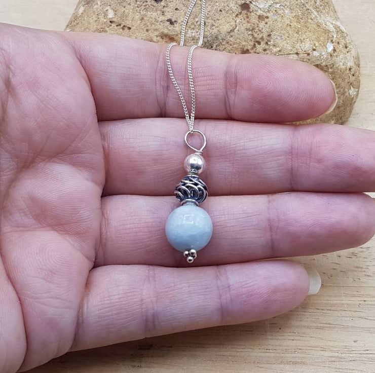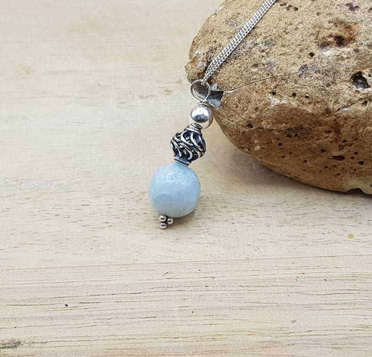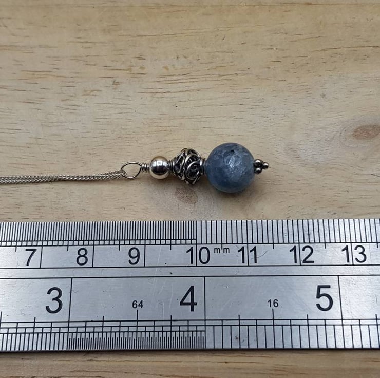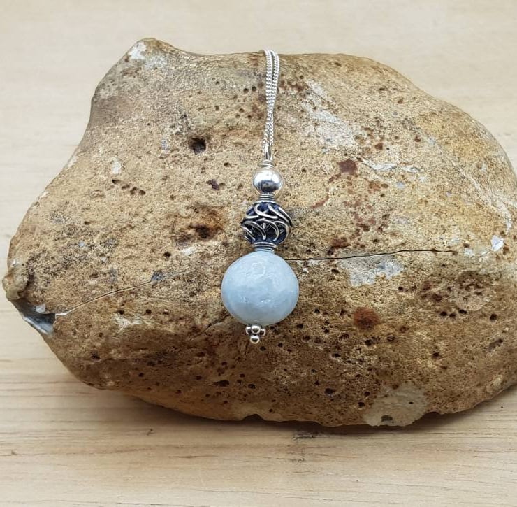 This is a Bali silver Celestite (celestine) pendant necklace with Bali silver beads are handmade beads by the world renown silversmiths of Bali and contain up to 99% silver. Bali silver is not hallmarked or stamped.