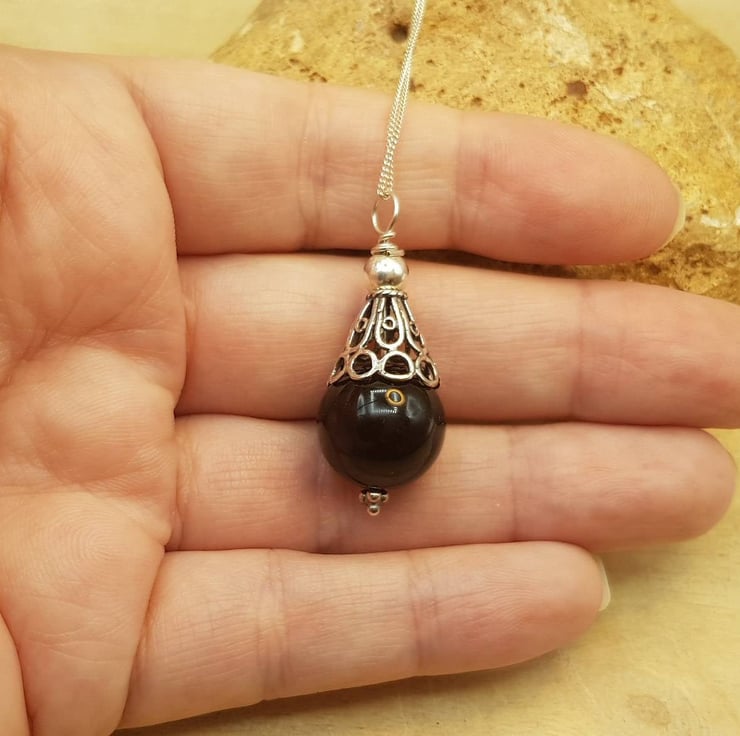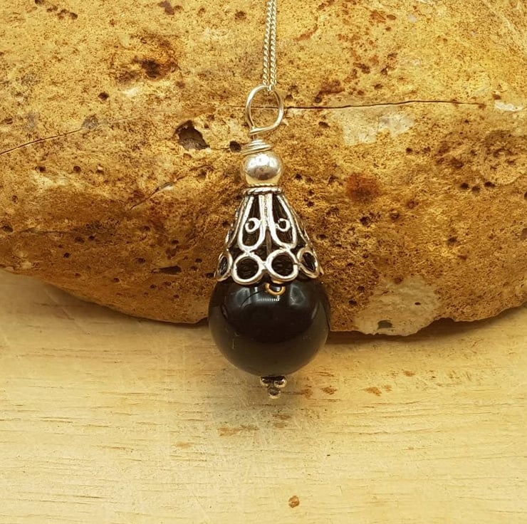This is a women's minimalist Bali silver black Onyx cone pendant.