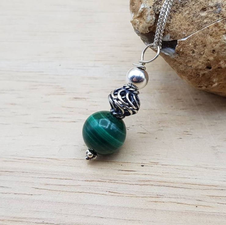 This is a women's small minimalist bali sterling silver Reiki attuned Grade A Malachite pendant necklace with Bali silver beads which are handmade beads by the world renown silversmiths of Bali that contain up to 999% silver. Bali Silver is not hallmarked or stamped. wire wrapped with sterling silver wire.