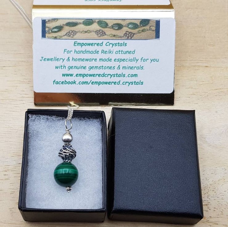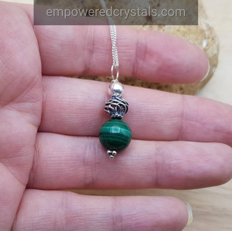 This is a women's small minimalist bali sterling silver Reiki attuned Grade A Malachite pendant necklace with Bali silver beads which are handmade beads by the world renown silversmiths of Bali that contain up to 999% silver. Bali Silver is not hallmarked or stamped. wire wrapped with sterling silver wire.