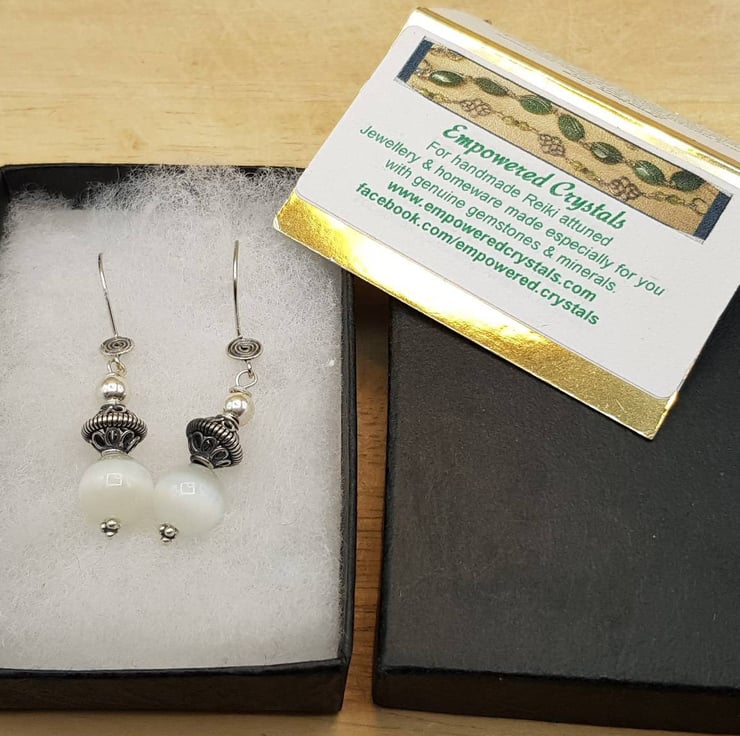 These are Bali silver selenite earrings. I have made these with Bali silver beads are handmade beads by the world renowned silversmiths of Bali and contains up to 99% silver but is not hallmarked or stamped.