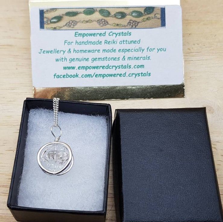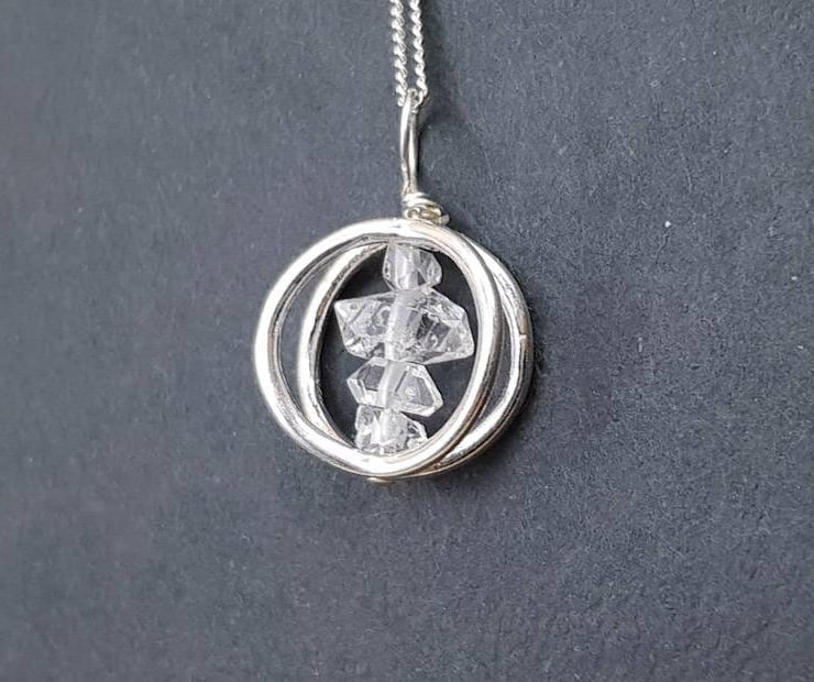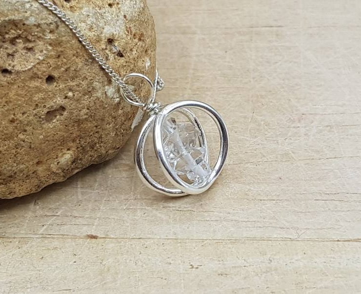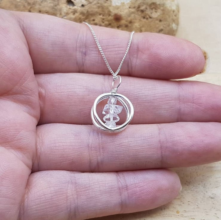 This is small minimalist raw Herkimer Diamond Sterling Silver 3D circle pendant necklace. Perfect for a stylish minimalist present or an April birthday. Stones will vary from the photos.