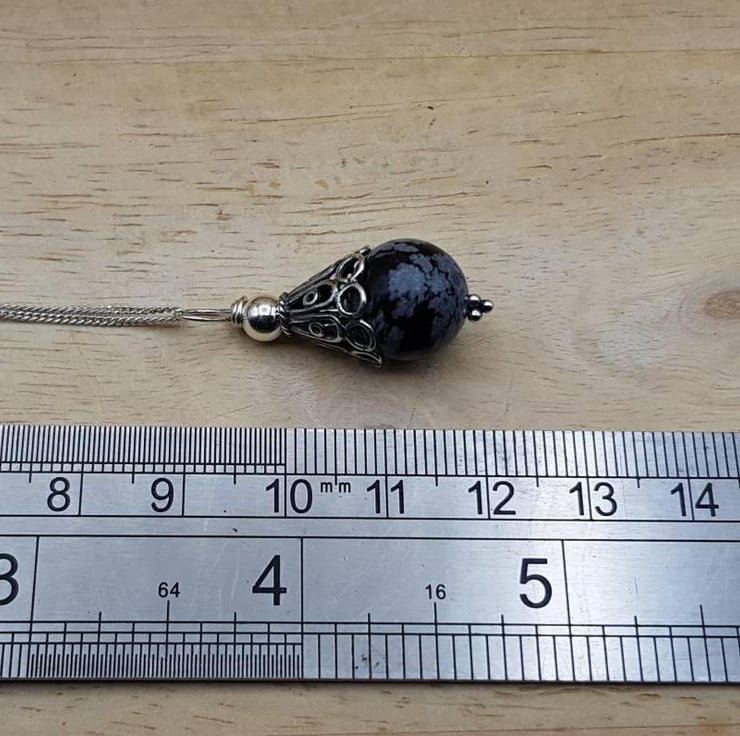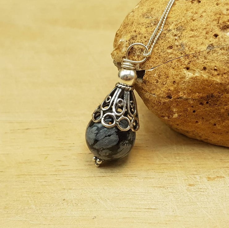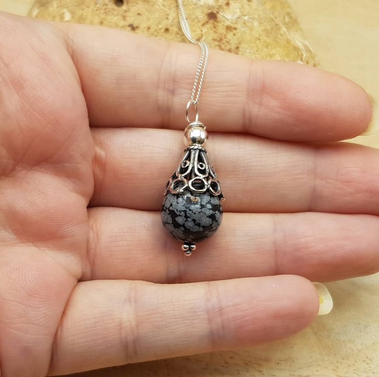 This is a women's silver Snowflake Obsidian cone pendant necklace. I have made this with Bali silver beads which are handmade beads by the world renown silversmiths of Bali and contain up to 99% silver. Bali silver is not hallmarked or stamped.
