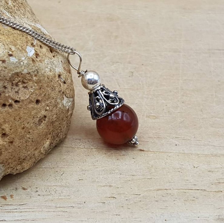 This is a sardonyx pendant with Bali silver beads. Bali silver beads are handmade by the renown silversmiths of Bali and contains up to 99% silver. Bali silver is not hallmarked or stamped. Stones will vary from the photos.