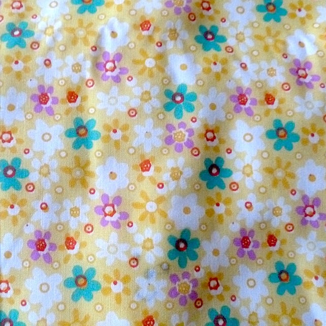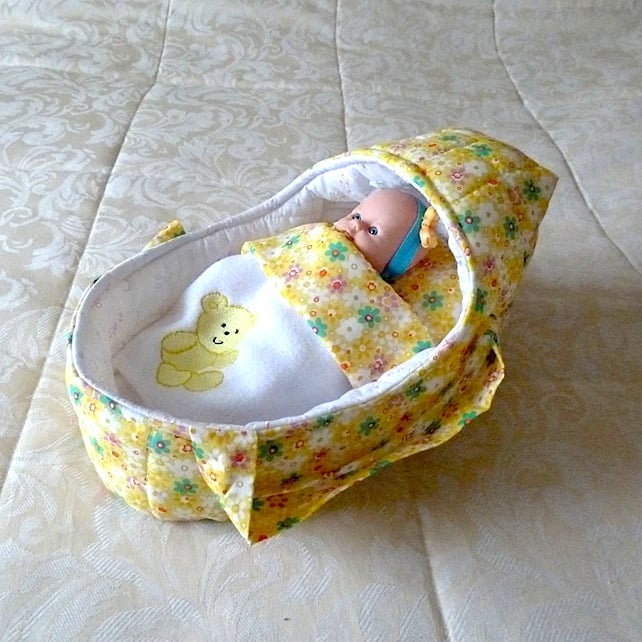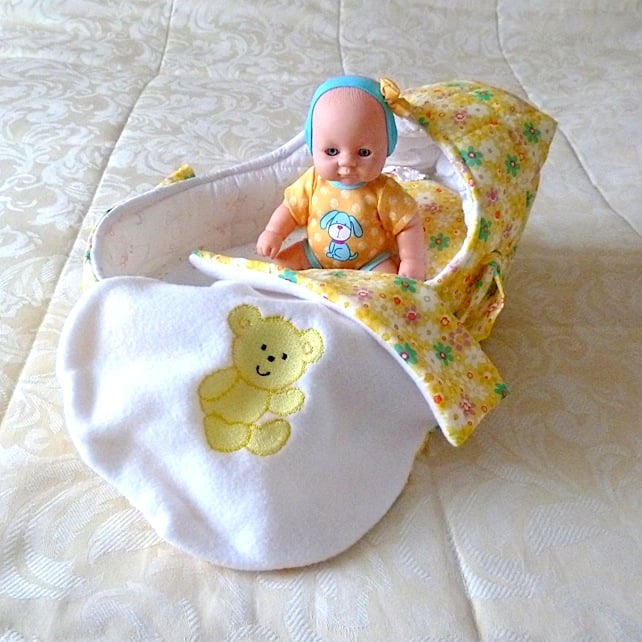 This pretty doll's carrycot is made from yellow polyester cotton which has a multi coloured small daisy design.
