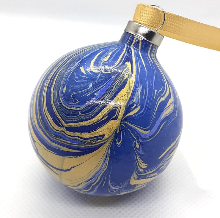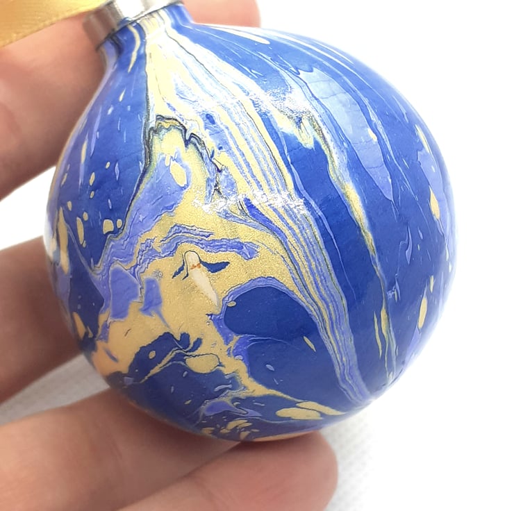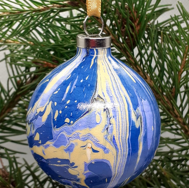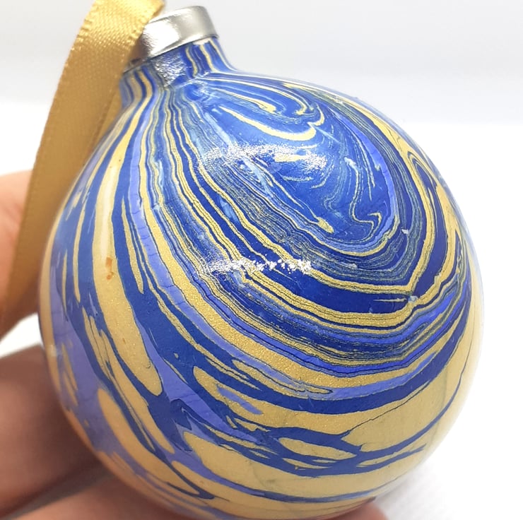 The 'Starry Night' bauble! Completely and unintentionally reminds me of Van Gogh's beautiful painting. Rich, deep, inky blue swirls with a paler blue and gold on this one off marbled bauble. One of my absolute favourites.