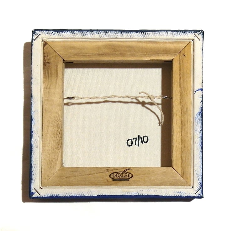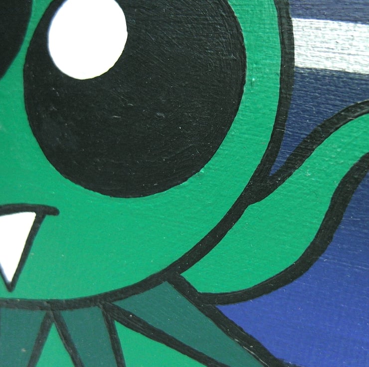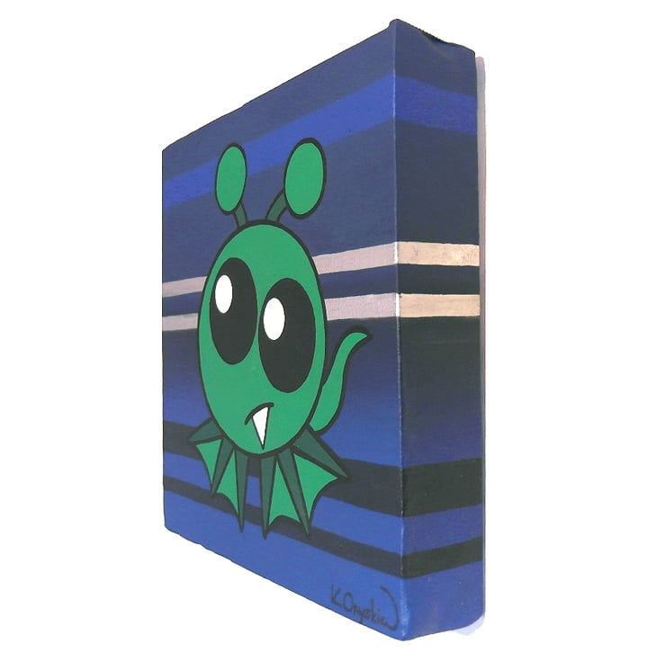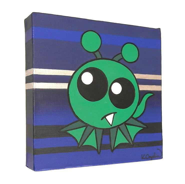 The cartoon alien art is painted in acrylics (with enamel for the silver), on a 20cm square canvas with 3.8cm deep edges (8" square with 1.5" edges) The stripes carry on over the edges of the canvas so there is no need for framing.
