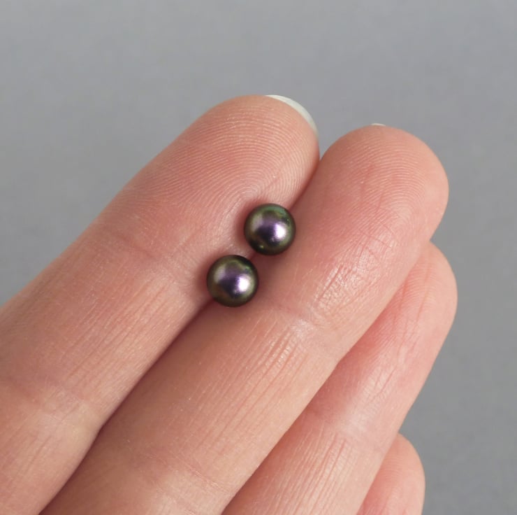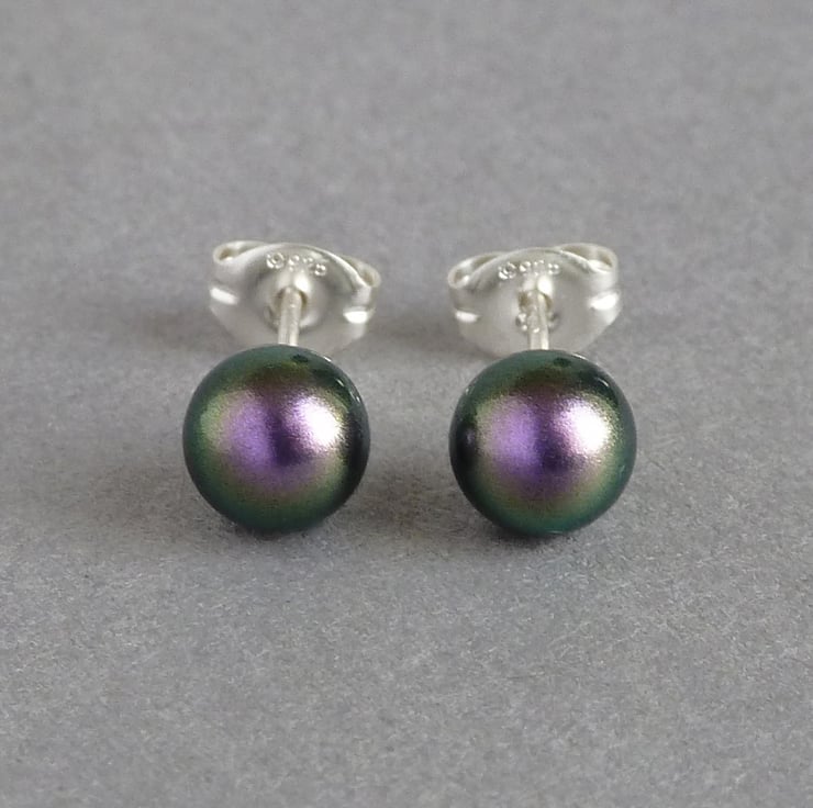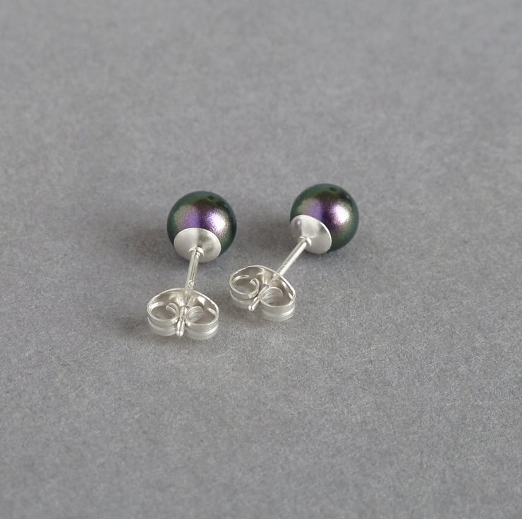 These round, purple stud earrings have been created using 6mm iridescent dark purple glass pearls. Each multi-coloured pearl has a purple centre and an outer halo of dark green. As each pair arrives individually gift wrapped, these small pearl studs make perfect gifts for women who love colourful jewellery.
