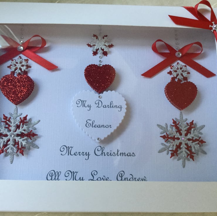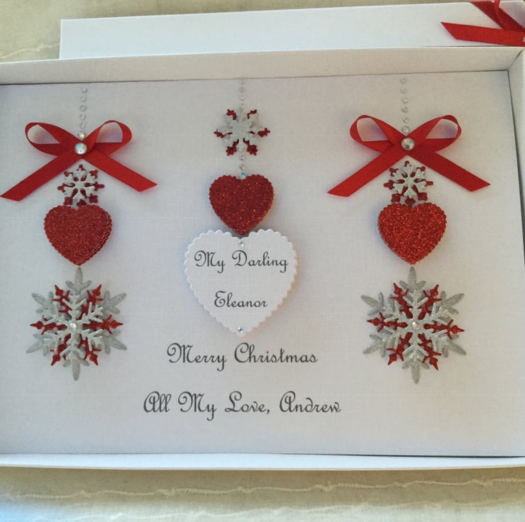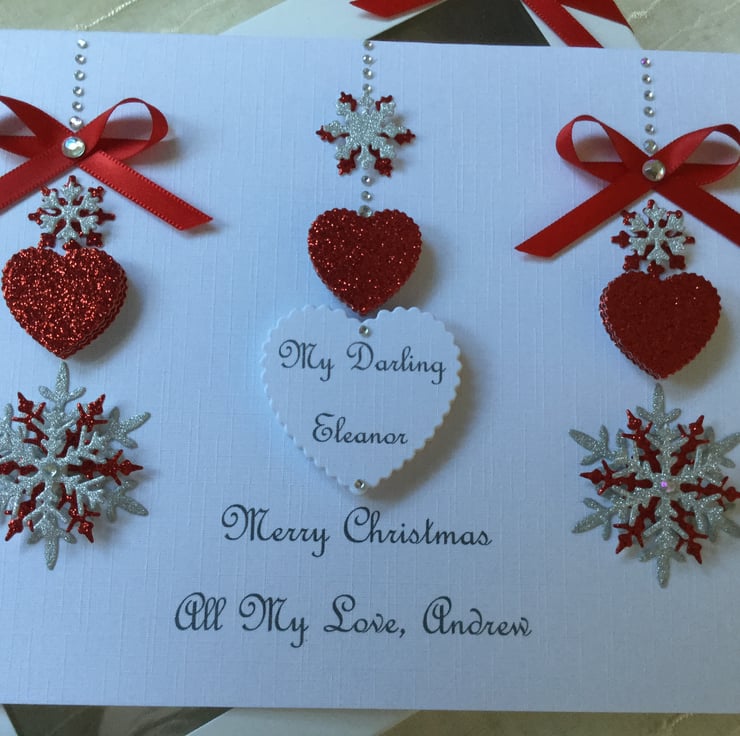 This handmade personalised Christmas card is A5 in size ( 210mm x 150mm) and is on 300gsm heavyweight linen card. This card is personalised with the name on the heart along with the text of your choice underneath.