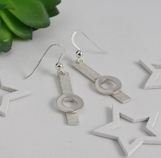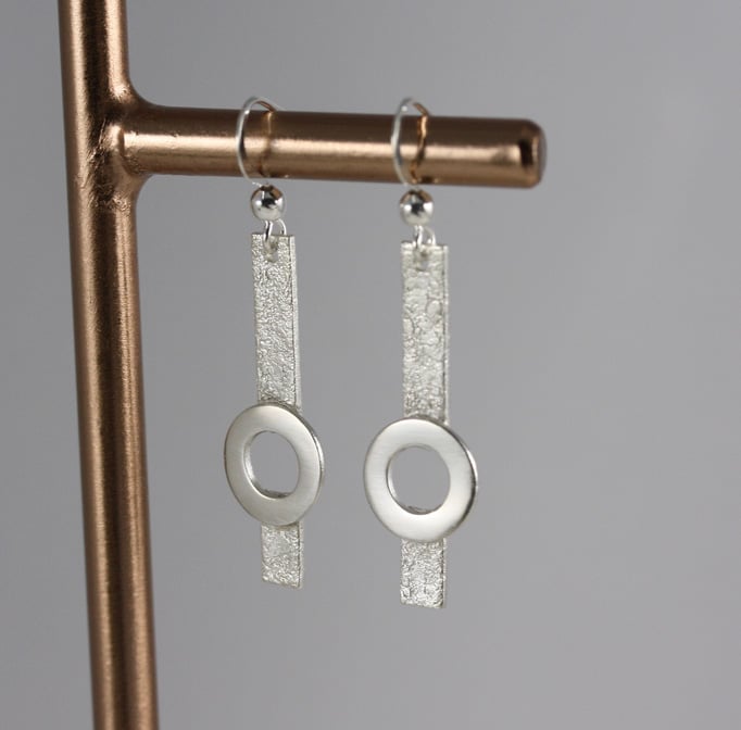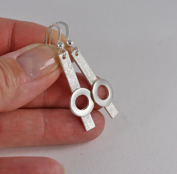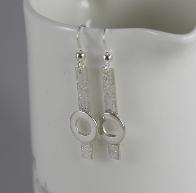 Long fine silver earrings in a matt finish with a shiny silver hoop to the centre finished with sterling silver ear wires. The approx length is 31mm (not including the ear wires).