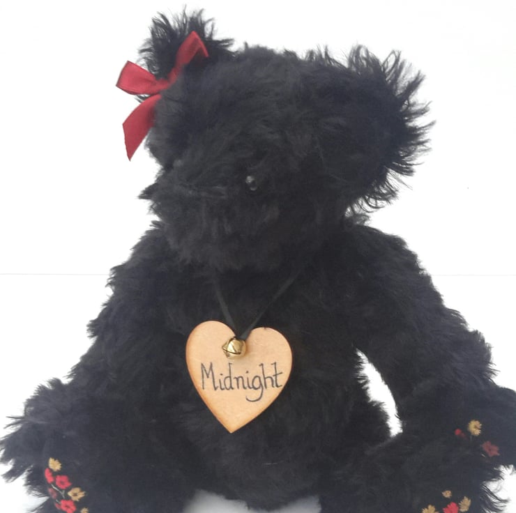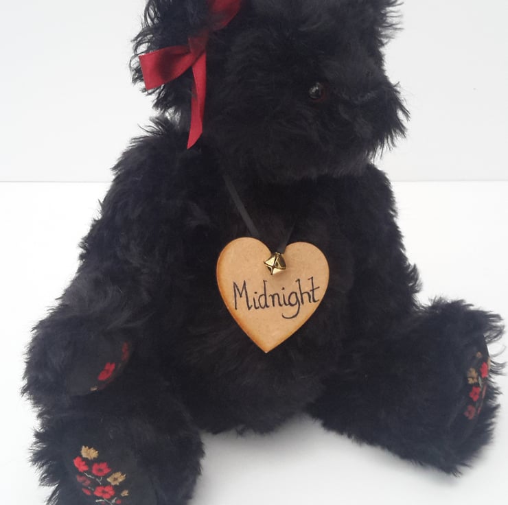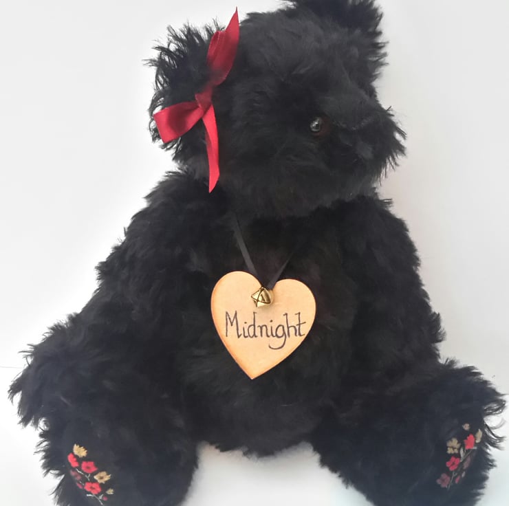 Meet Midnight a luxury artist bear. Hand made from 20mm whirl, Helmbold Mohair in black.