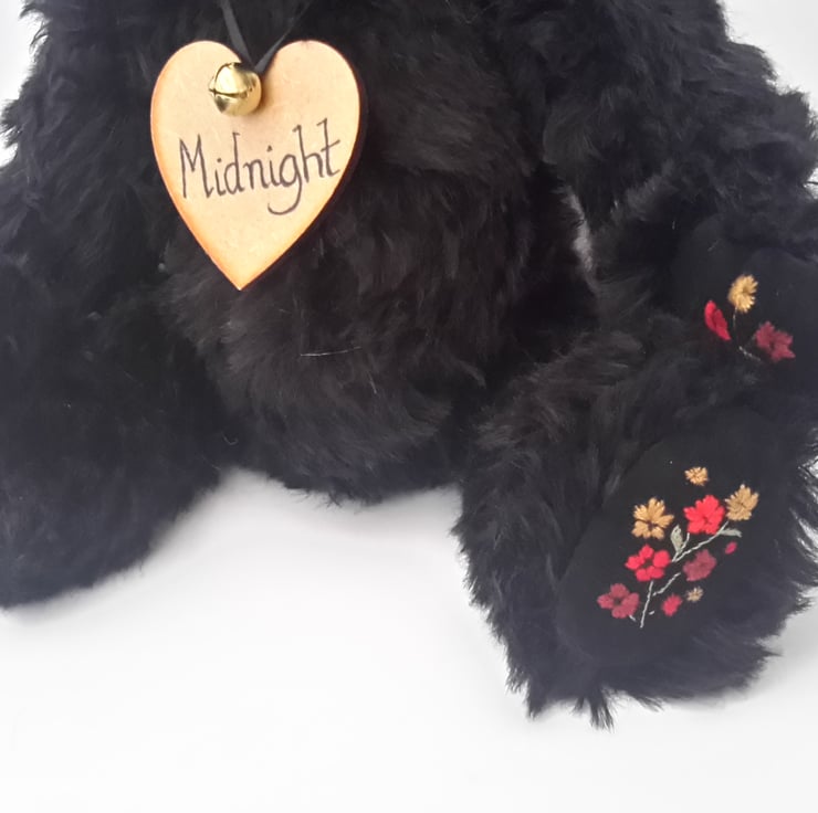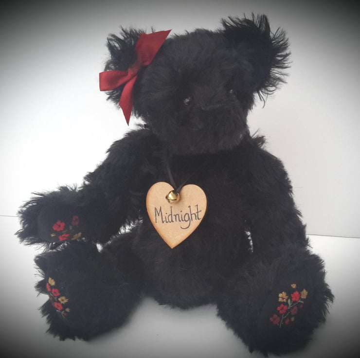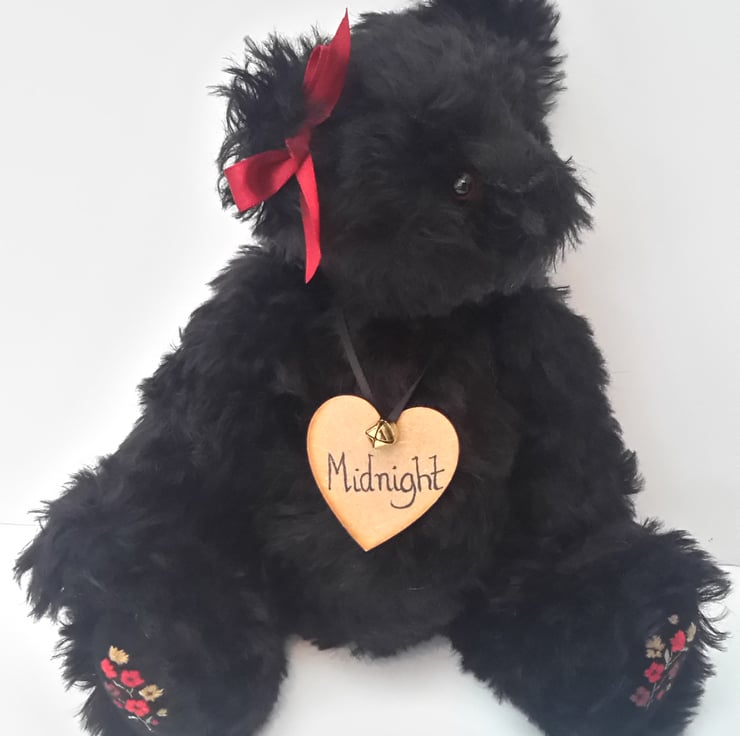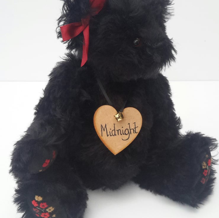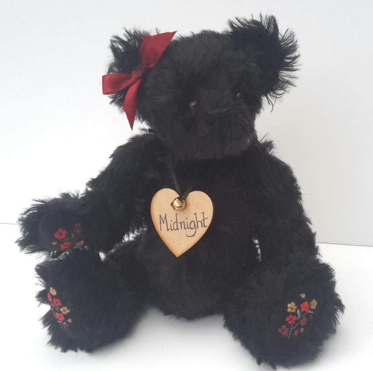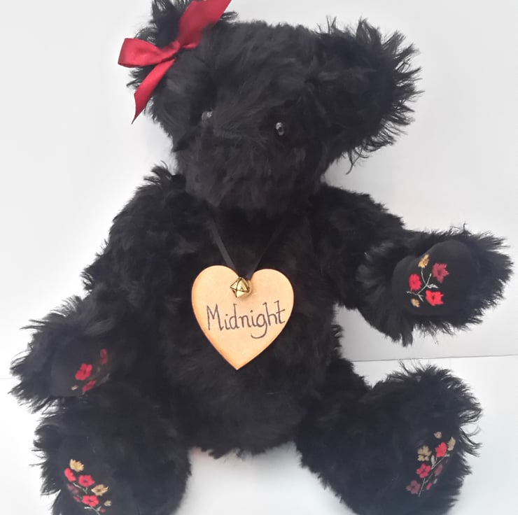 She is a beautiful unique bear, I have only made 2 or 3 black mohair bears since starting Bearlescent in 2014 and she is the first to have red embroidery to her paw pads.