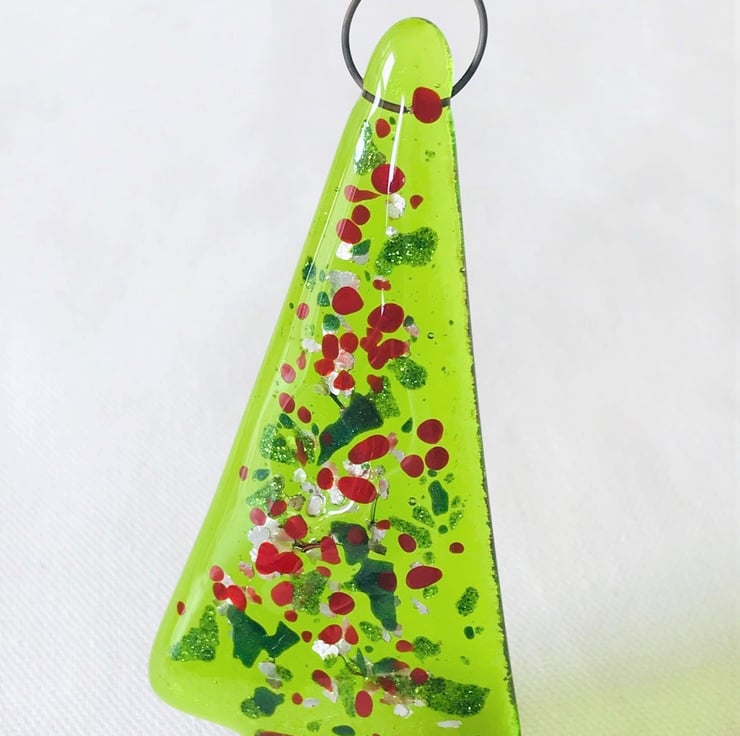 Made from transparent green glass it has an opaque red bucket and details, silver sparkles fused inside the tree and green glittery glass on the top.....a little beauty!