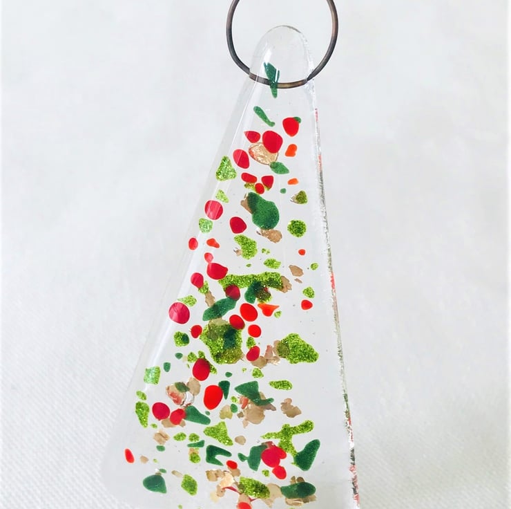 Made from transparent glass it has an opaque red bucket and details, gold sparkles fused inside the tree and green glittery glass on the top.....a little beauty!