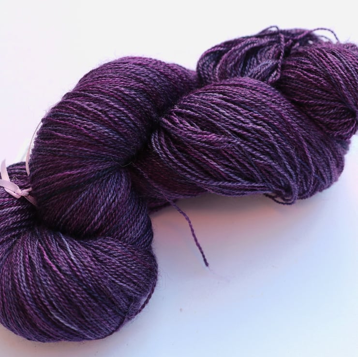 Semi-solid purple with lilac and dark violet hints. This lustrous, lofty, silky-soft yarn should make beautiful lace projects. Photographs have been taken and edited in bright natural light.