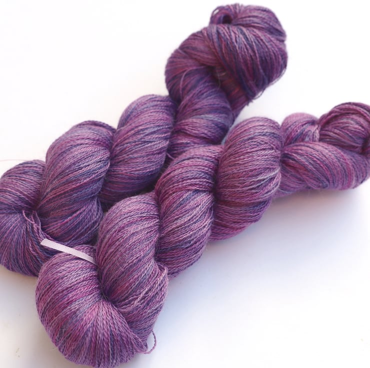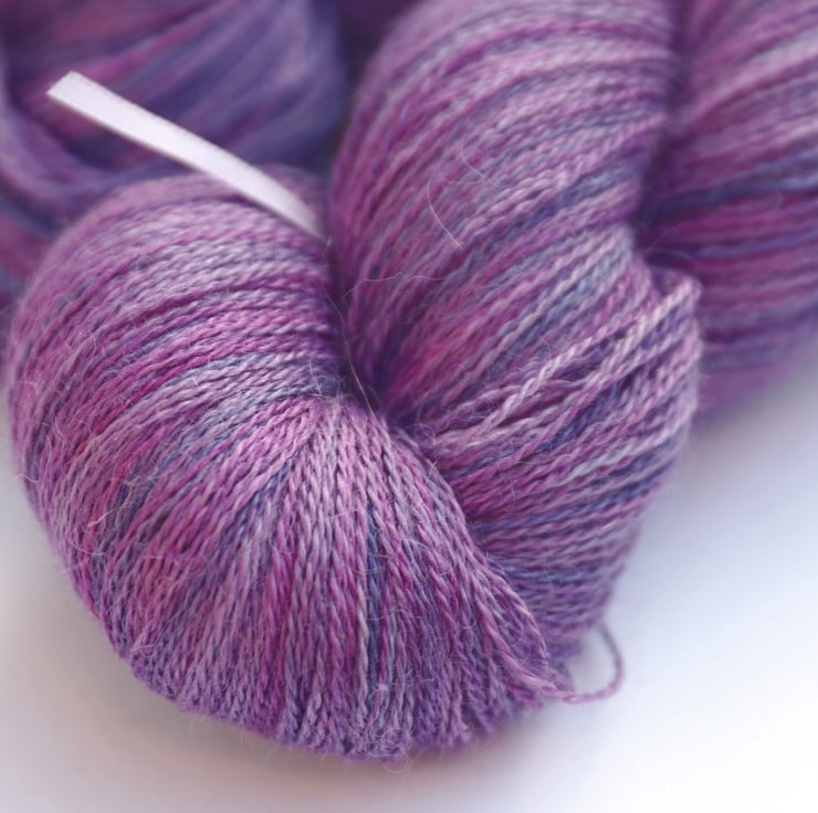 Semi-solid/tonally variegated lavender and lilac-pinks with purple and some silvery cornflower hints. This gorgeous and luxurious yarn has the softness and warmth of alpaca with the smooth sheen and cool feel of silk. It should make beautiful lace projects. There is one skein left. Photographs have been taken and edited in bright but wintery natural light.