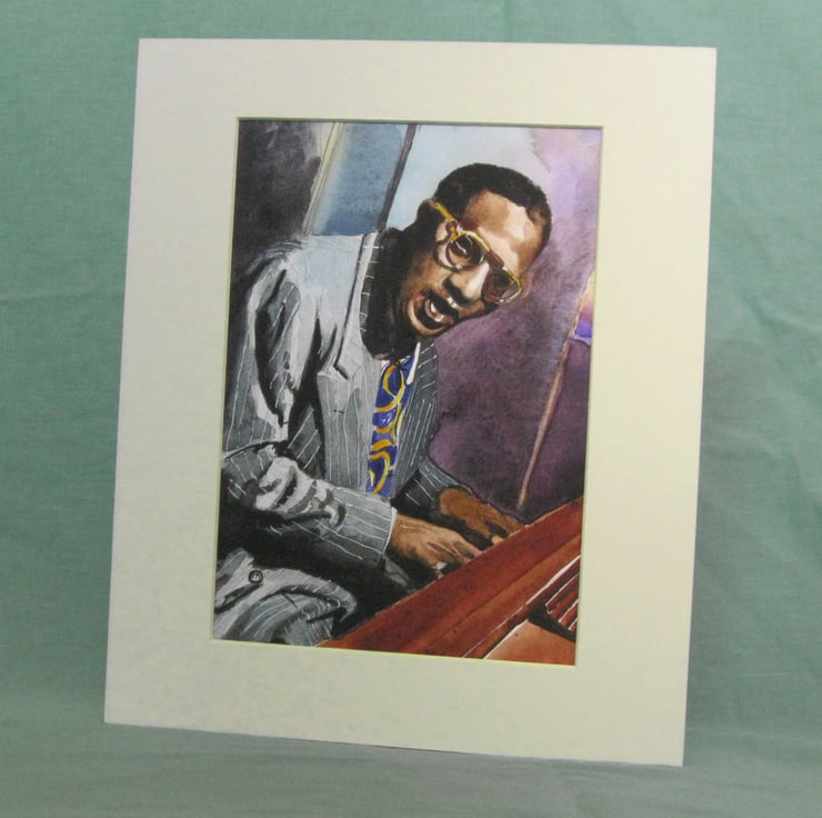 Watercolour portrait of jazz pianist and composer Thelonious Monk. 16 x 23 cm, Supplied window mounted, overall size with matte 25.4 x 30.5 cm (10 x 12 in). Will fit a standard sized frame.