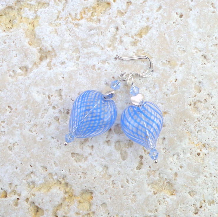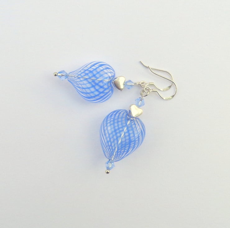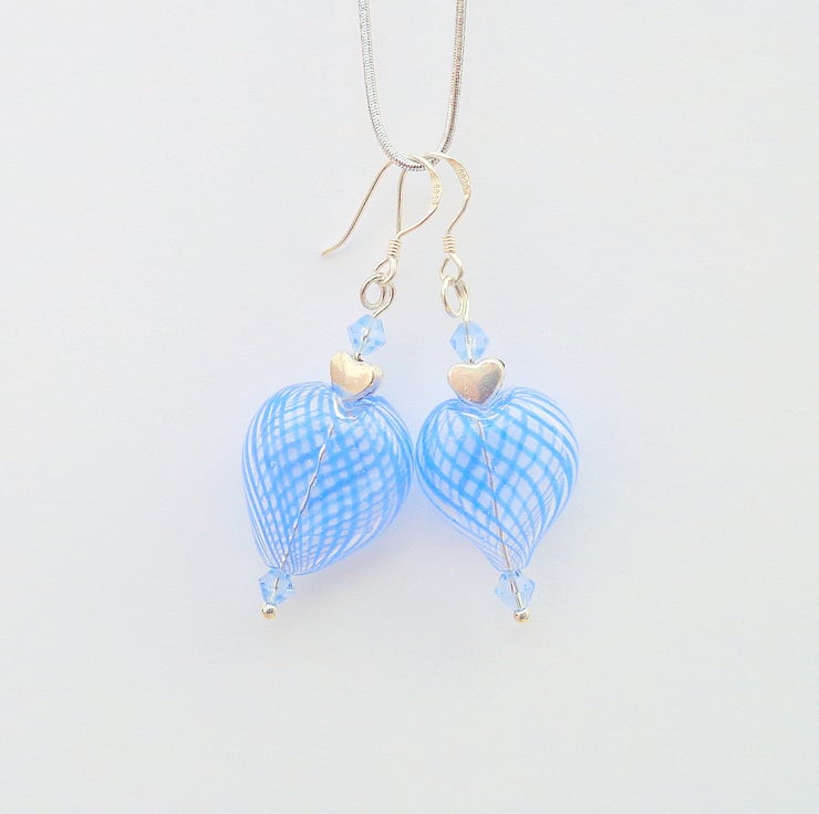 Above the glass heart there is another tiny silver heart & a blue crystal at the top & bottom. The drop (top to tip as worn) is just 5 cms and the headpin (through the heart) is silver-plated.