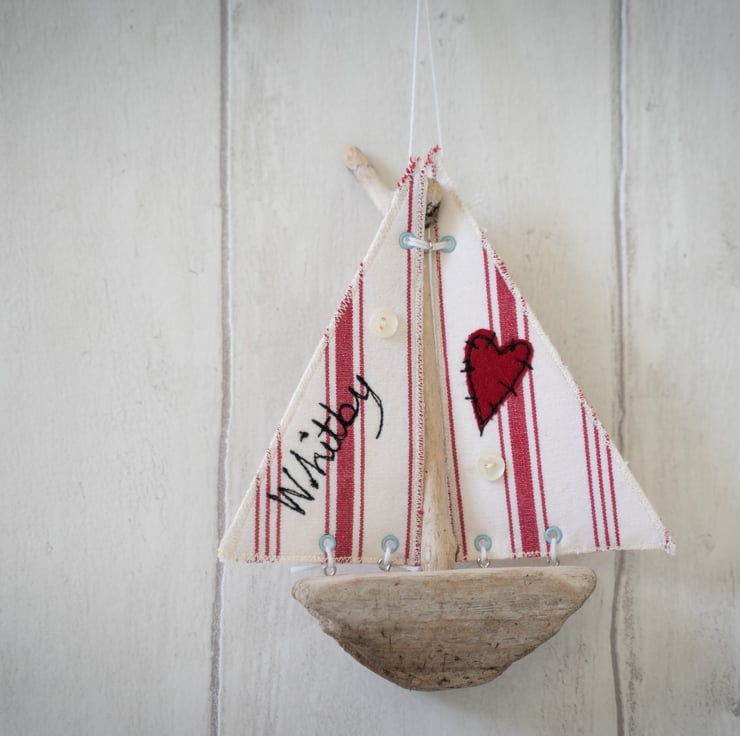 Made from driftwood and fabric this unique little boat would look lovely hanging in any coastal setting but especially one in Whitby! Using free motion machine embroidery, (“drawing” with the sewing machine), the fabric has been embroidered with the word “Whitby” and a heart applied along with tiny button detail. The fabric is lovely quality red striped cotton.