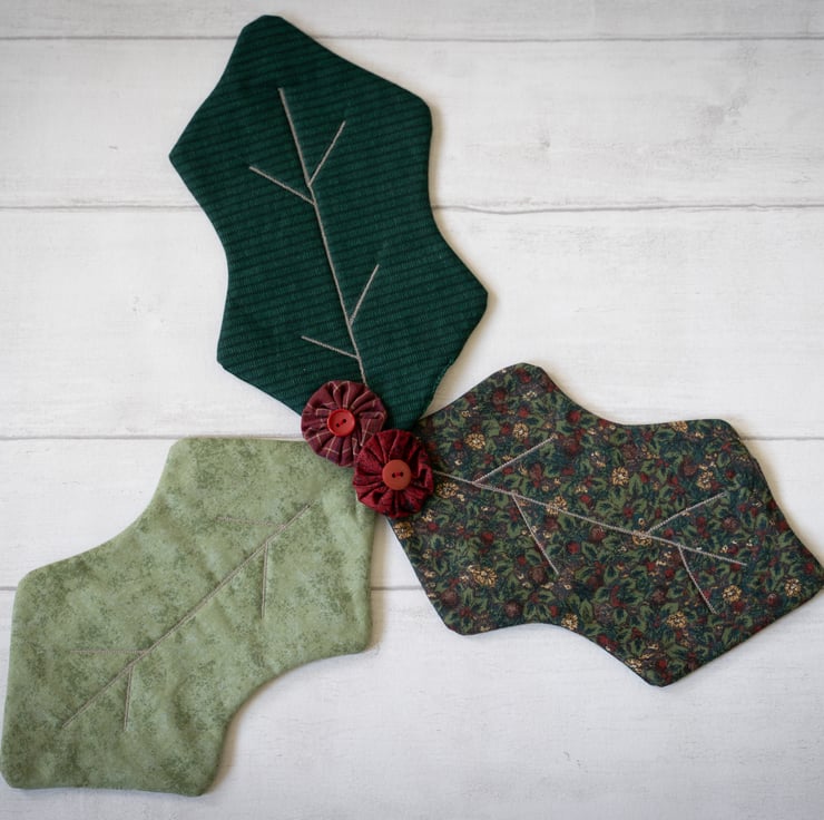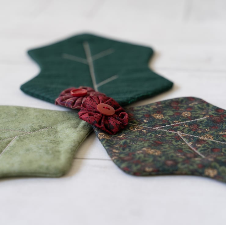 Comprising of three large machine embroidered green holly leaves, it features two large berries with a button finish!