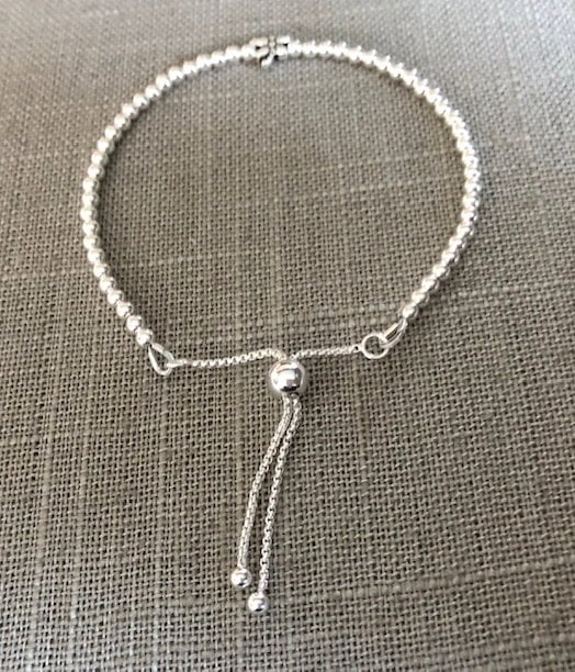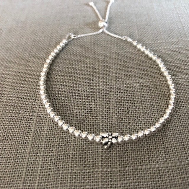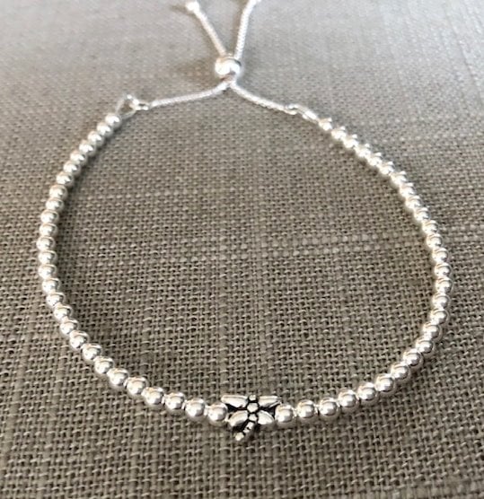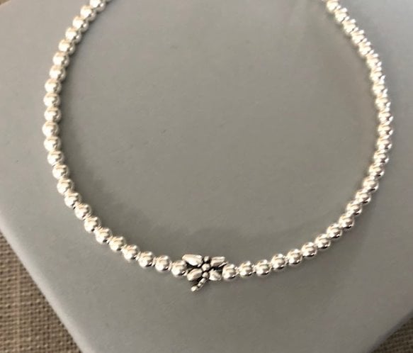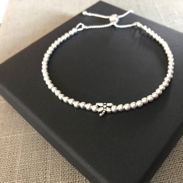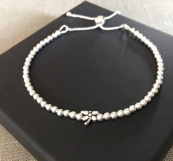 Dragonfly Sterling Silver Slider Clasp Beaded Bracelet - Handmade bracelet made with 3mm Sterling Silver beads with a Sterling Silver Dragonfly charm bead in the centre. The bracelet is finished with a Sterling Siliver fully adjustable slider clasp.