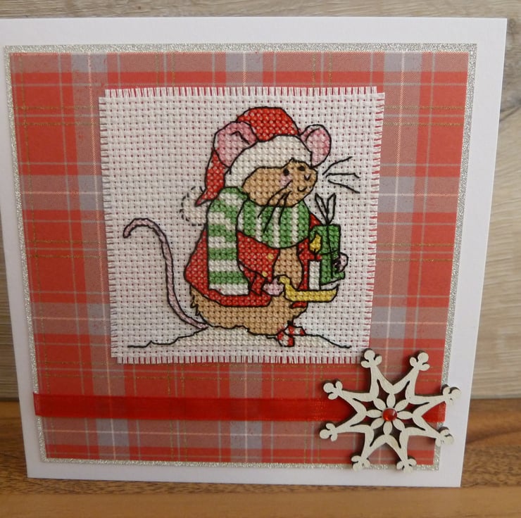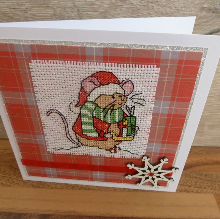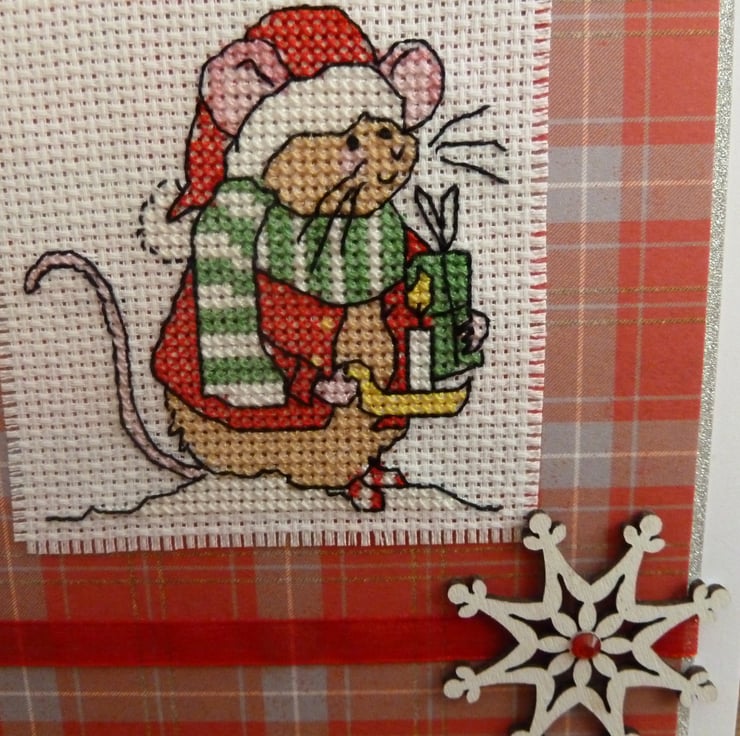 A handmade Christmas card which has been made with red patterned paper, a cross stitched mouse, red ribbon and a wooden snowflake.