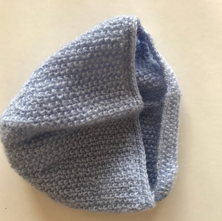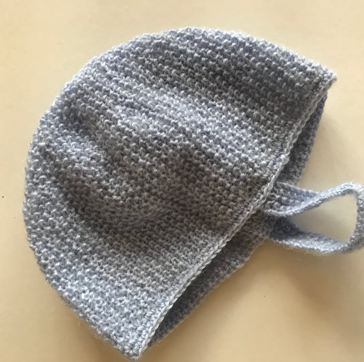 This hat is knitted from a vintage pattern using vintage yarn. The yarn contains mohair so it has a slight fluffy look. The hat which is a helmet style has an all over pattern and fastens under the chin with a strap and button. I think that the pattern size is on the large side and would fit an older baby so please check the measurements