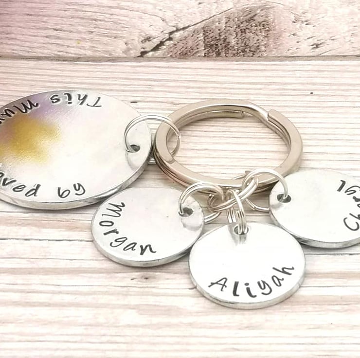 This multiple charm keyring be made to order by hand stamping each individual letter onto the blank aluminium metal discs. They are then polished and finished by painting each letter with black ink.