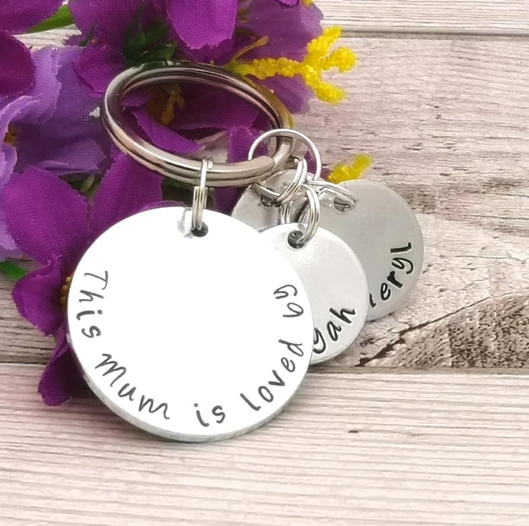 Personalise this keyring with your choice of wording on the larger disc, and personalised name charms. The perfect gift for a special Mum.