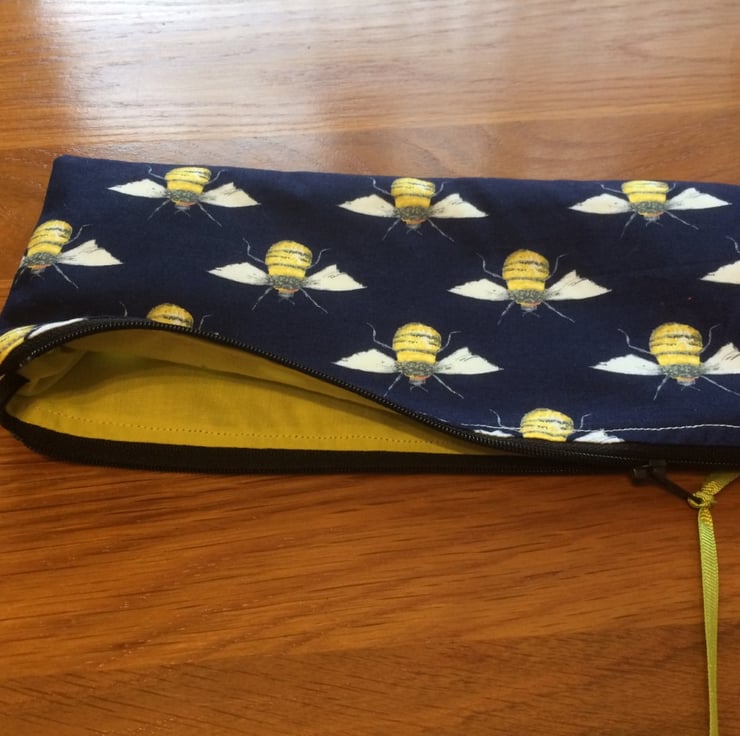 Pencil case in a navy blue and bumble bee print , lined in a plain yellow cotton