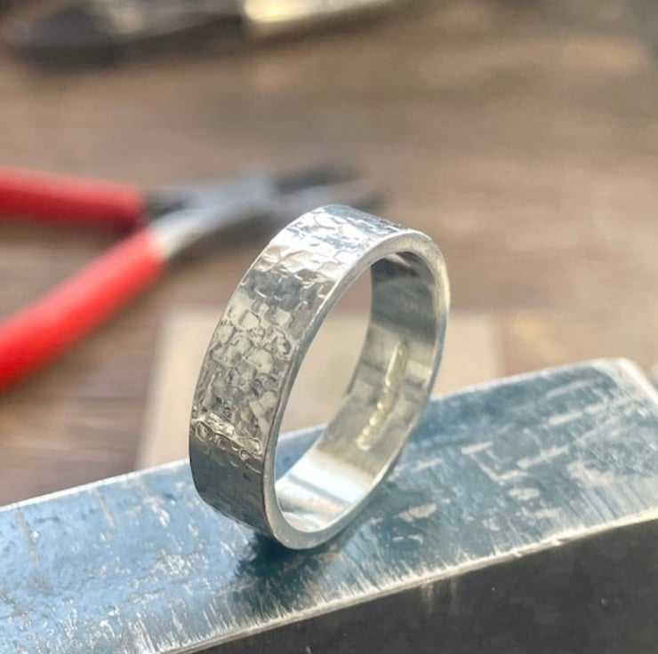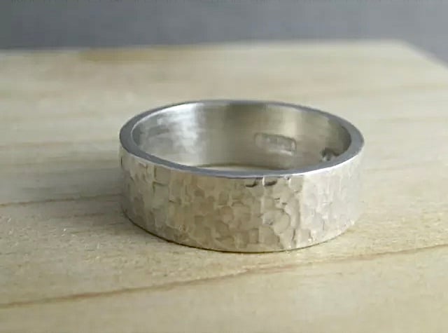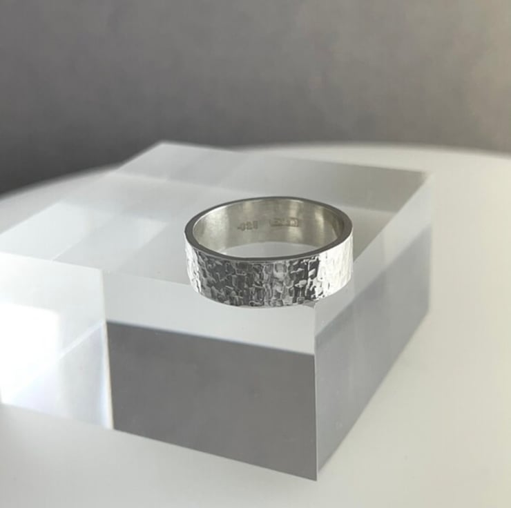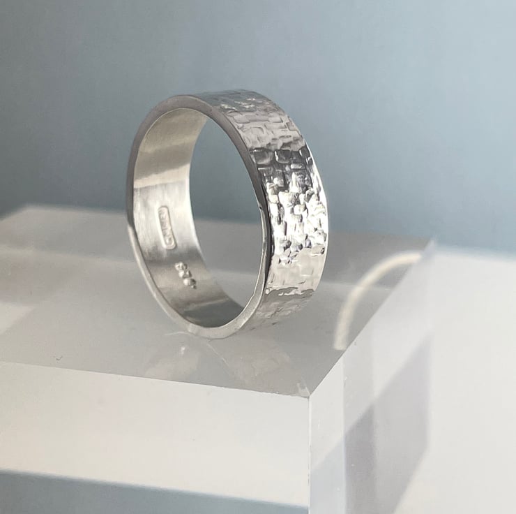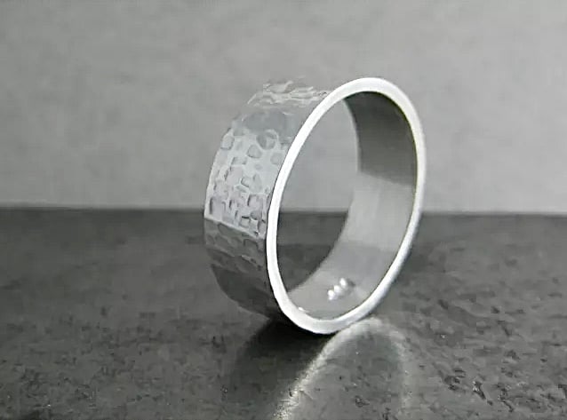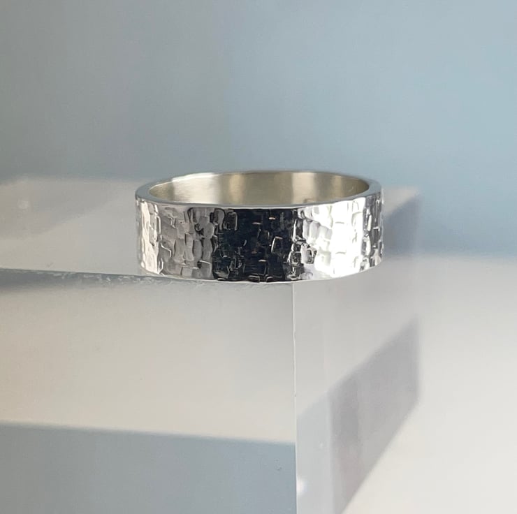 A lovely wide band handmade from 925 sterling silver. Cut by hand from solid 1.2mm thick silver rectangular wire, formed into a ring then hammered to create an attractive sparkly textured surface