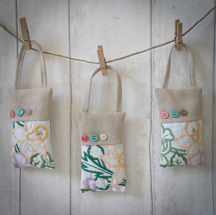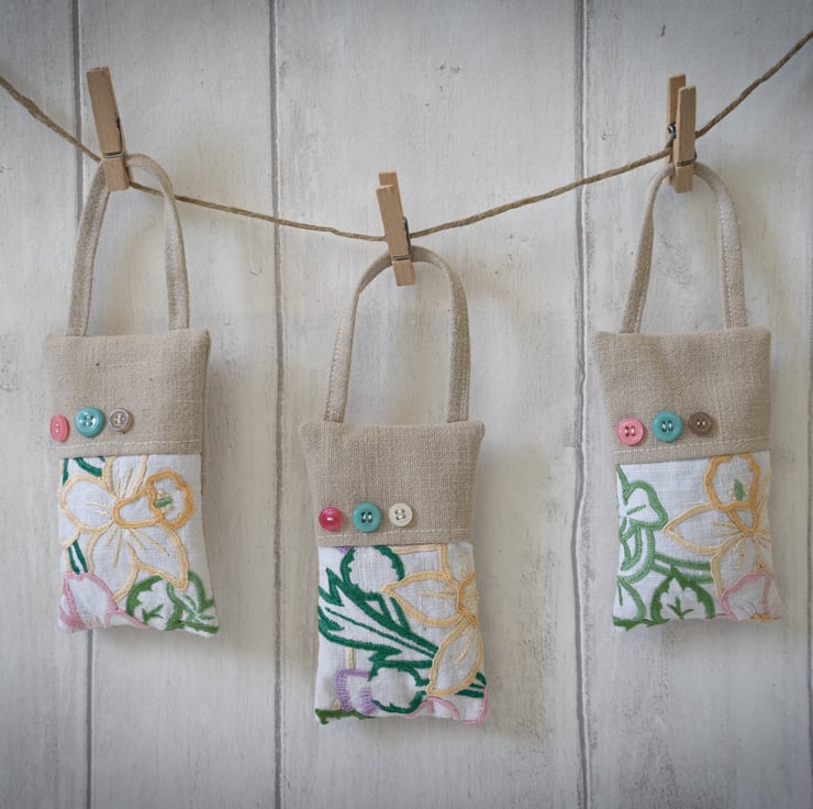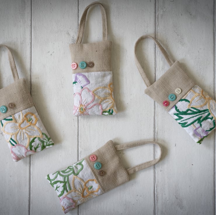 This listing is for one lavender bag made from a piece of vintage embroidery and a plain linen fabric.