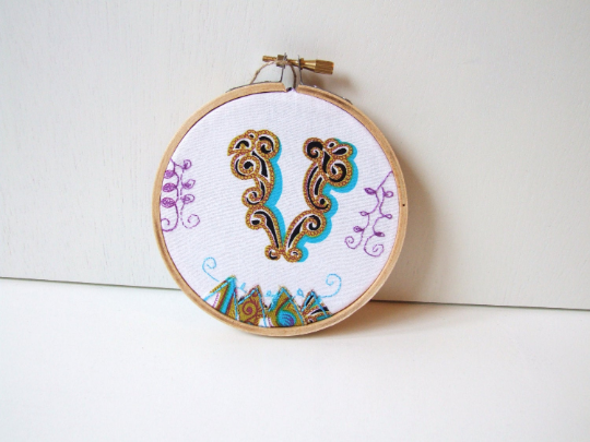 A V embroidery hoop that shows a capital letter V in a circus type font. The turquoise blue, golden yellow and black graphic would work well in a little girl or boy's room or a room with a circus theme. It’s equally at home on a shelf or hanging on a wall.