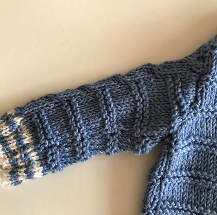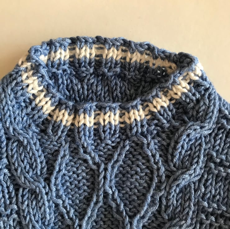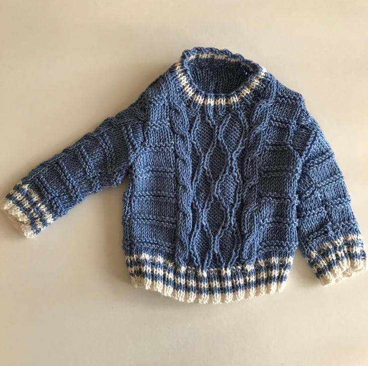 This lovely little jumper is hand knitted in a yarn using natural materials. The finish is silky and soft. The jumper has a cable pattern on the front, back and sleeves. The lower band, cuffs and neck have narrow white stripes adding a nice contrast to the blue. The neck is quite stretchy making it easy to pull over a baby's head.