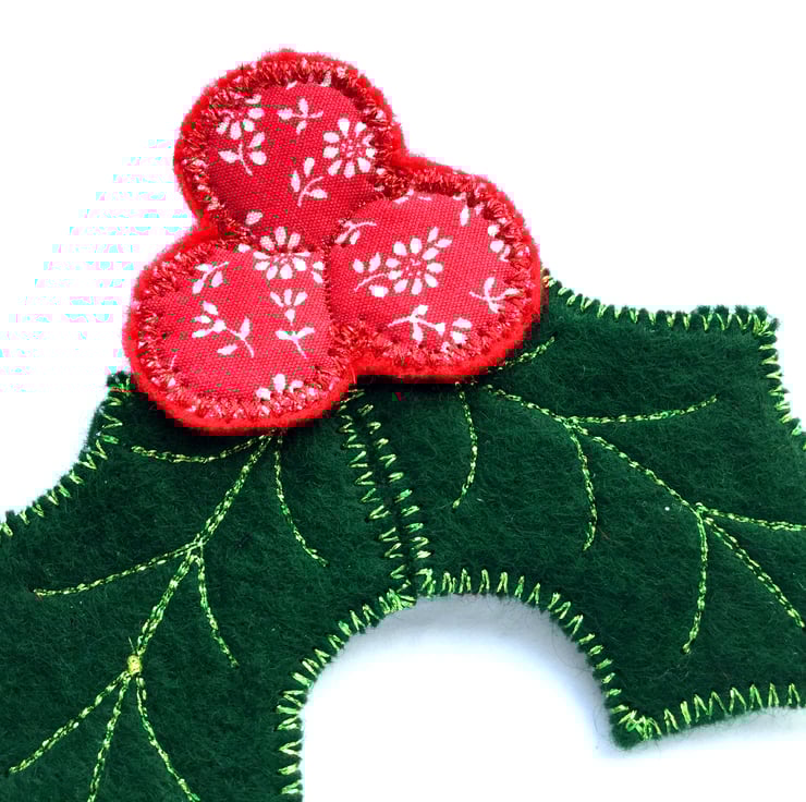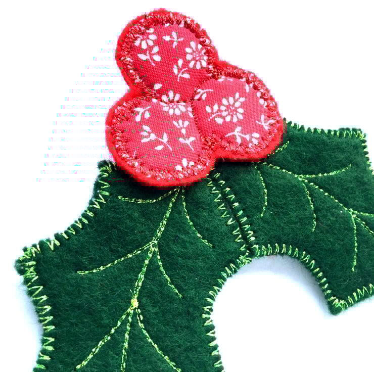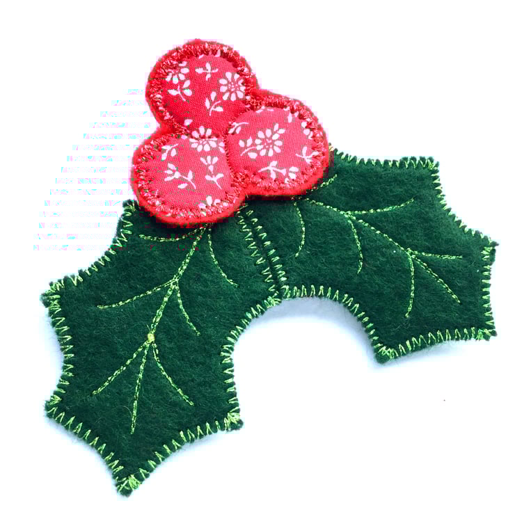 What better way to keep your festive spirits up than to deck your favourite coat or jumper with a lovingly handmade holly brooch? All of my holly brooches are unique because I make each one with a different combination of fabrics and/or stitching detail. This particular brooch has lush bottle-green felt leaves and juicy red ditsy-print berries. One of the main features of the brooch is the gorgeous shimmering metallic threads in both green and red. This little bit of sparkle will add festive magic to any dull winter's day.