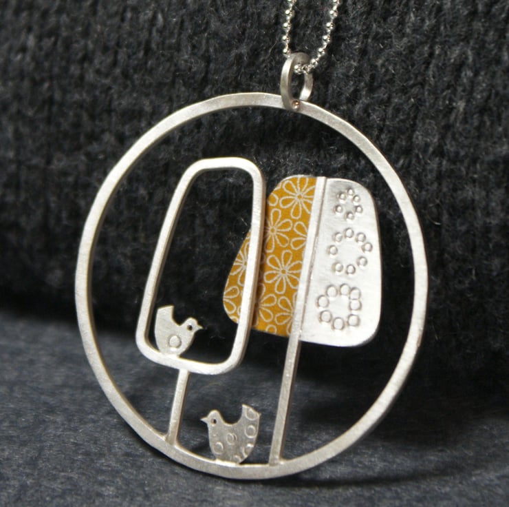 A cute necklace featuring 2 stylised trees and a 2 birds hand crafted from sterling silver and aluminium. I wanted the birds to be chickens but they didn't turn out quite like chickens so they are just 'chickenish'!