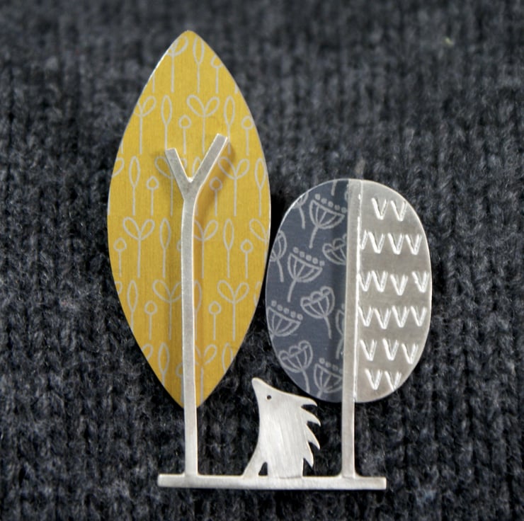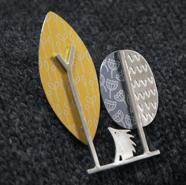 A cute brooch featuring 2 stylised trees and a little hedgehog hand crafted from sterling silver and aluminium. The framework is made from sterling silver square wire and silver sheet which has been textured with a zigzag shape. The coloured pieces are anodised aluminium which are blind riveted to the silver. The brooch pin is made from stainless steel as I find this provides more strength and holds it's shape. Please note your brooch may vary slightly from the image as each one is completely handmade.