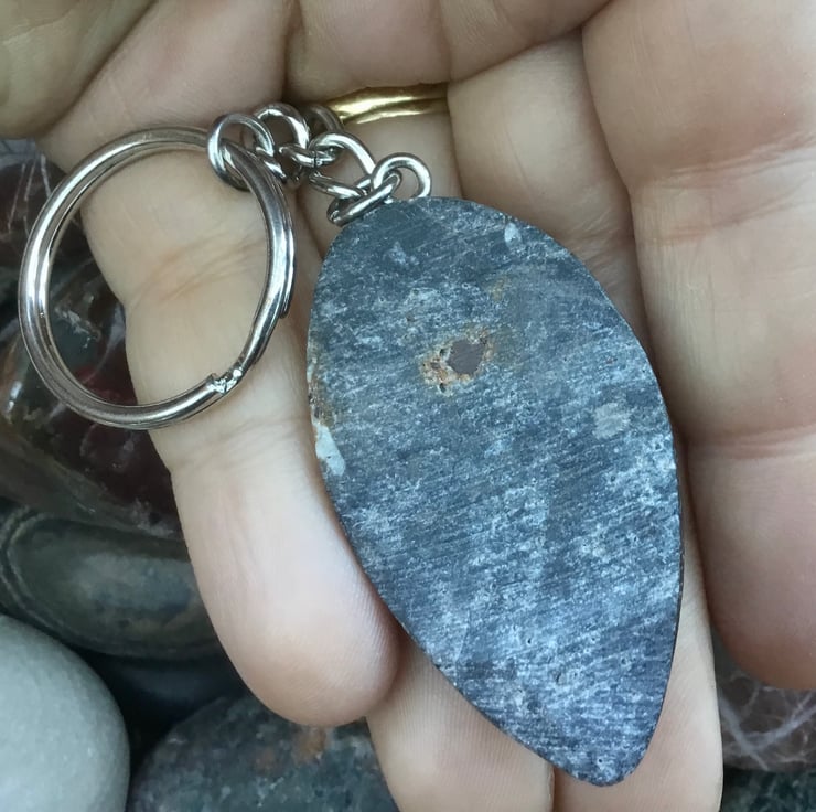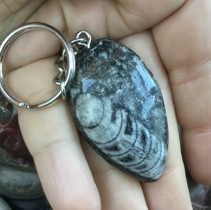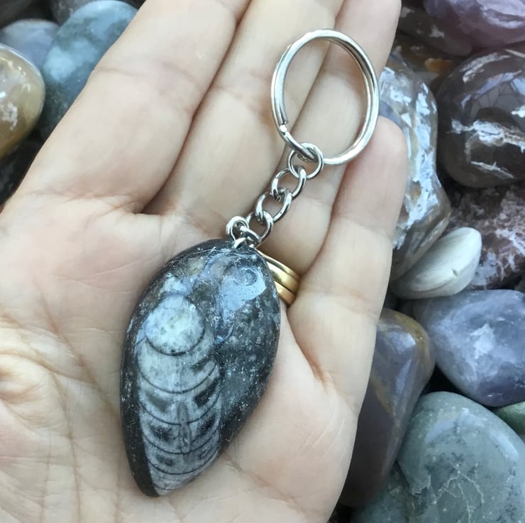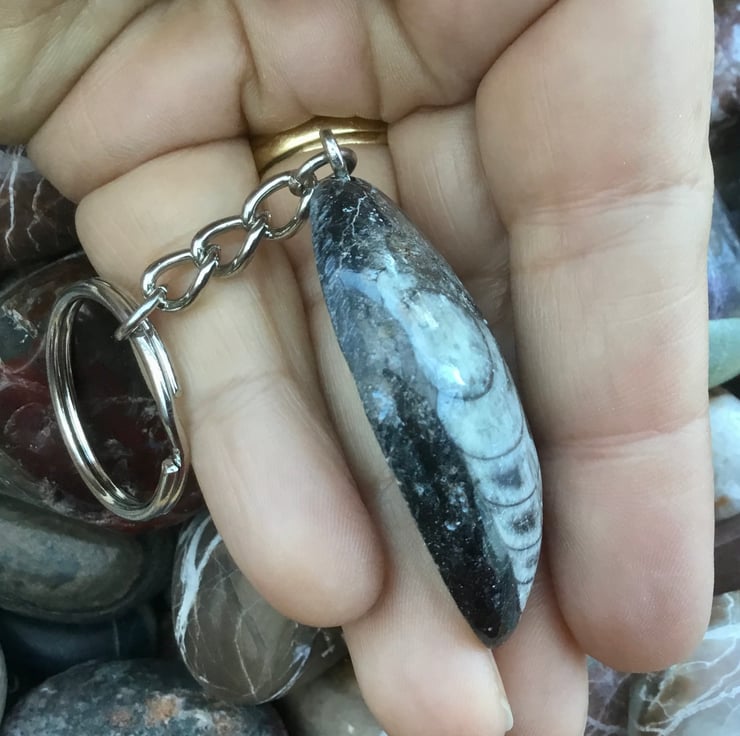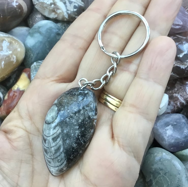 Lovely spear shaped orthoceras Fossil specimen, where the orthoceras is off centre, rounded and highly polished on the front surface & unpolished and uneven on the back, with rounded edges. It has been drilled centrally at the wider point of the teardrop & teamed up with a large silvertone rounded triangle bail, oval link key chain and 2.5cms diameter split ring.