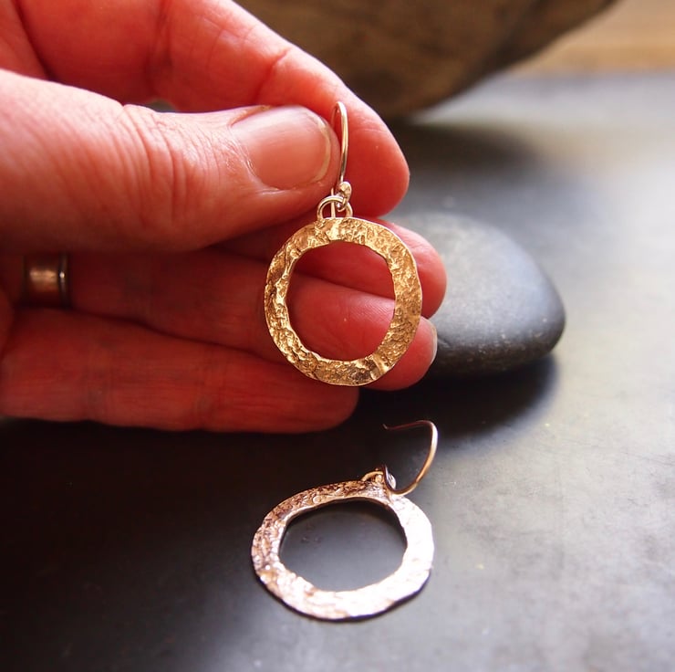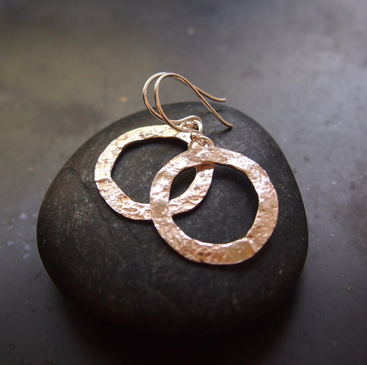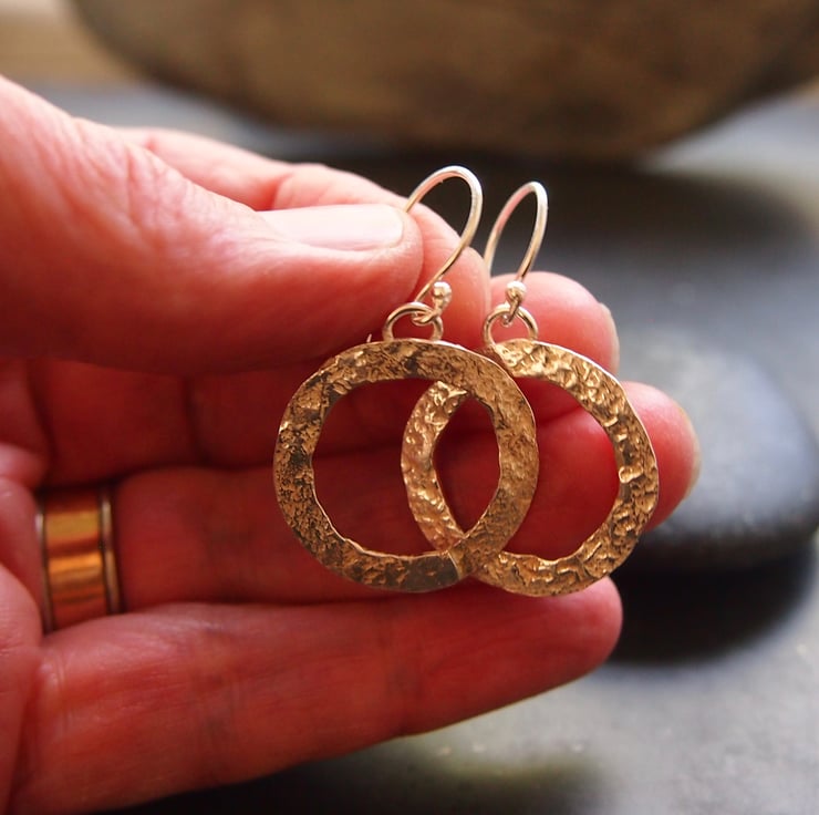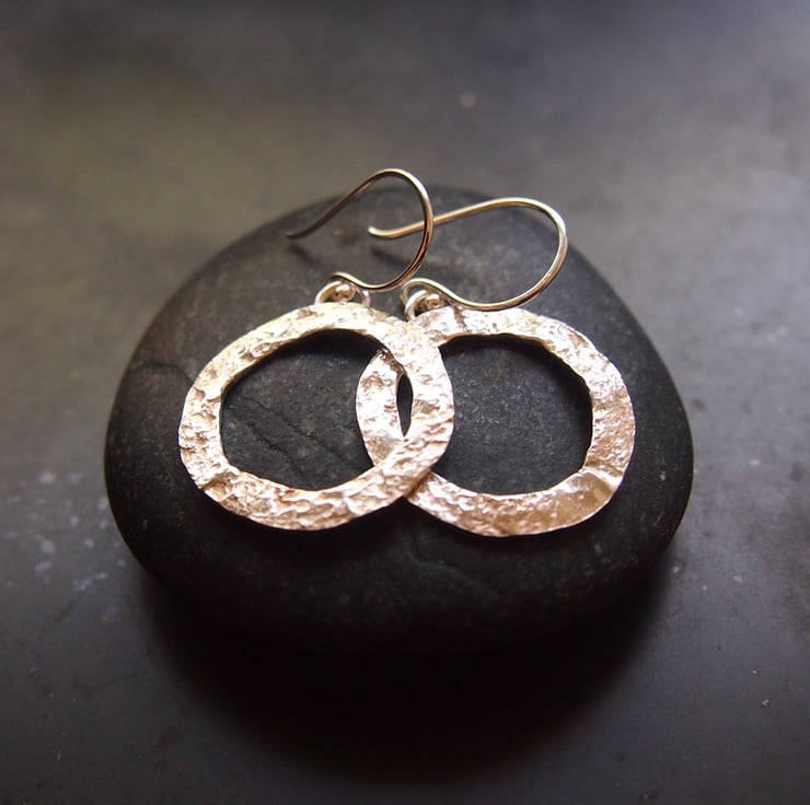 Heavily textured sterling silver circle earrings on hand made wires. These measure approximately 2.3cm across the circle and they have a lovely shine.