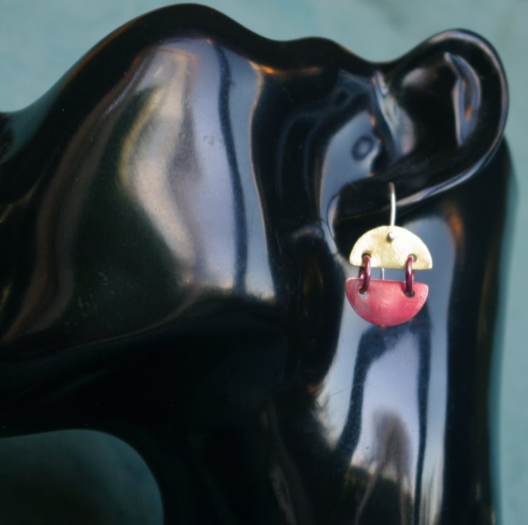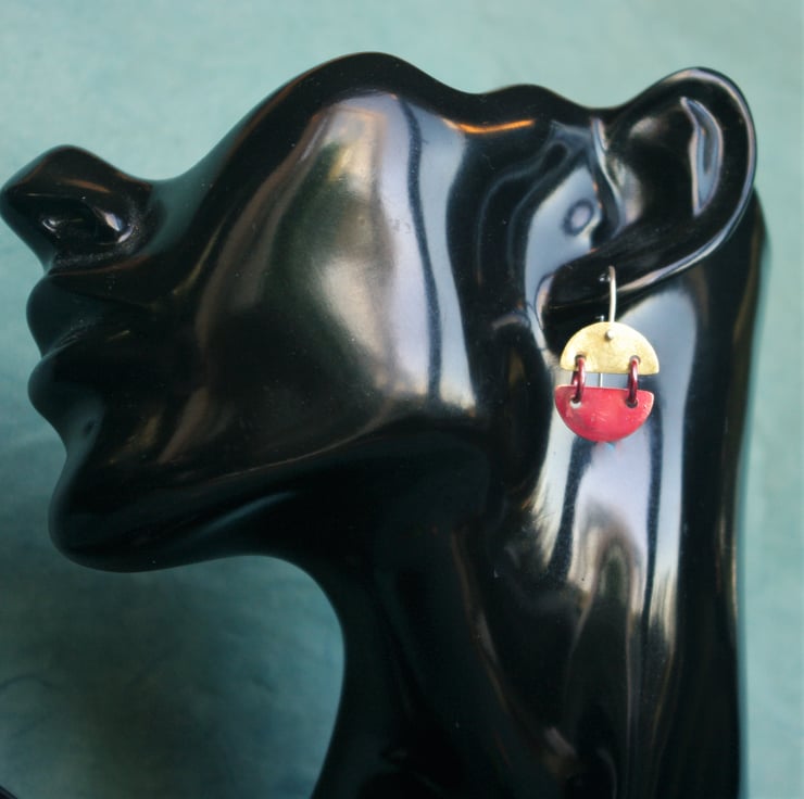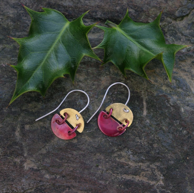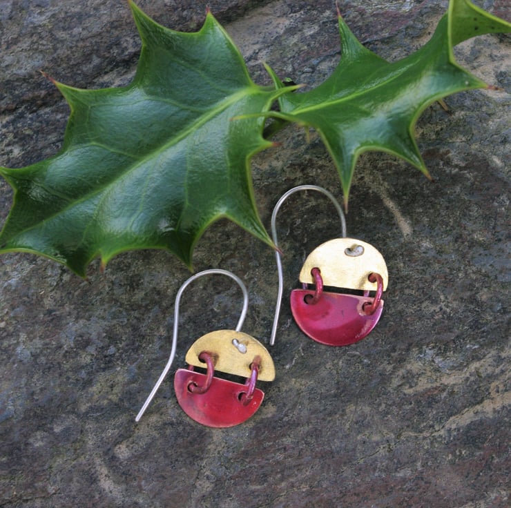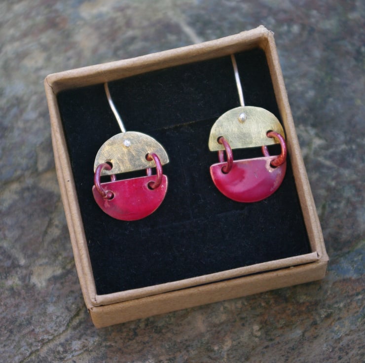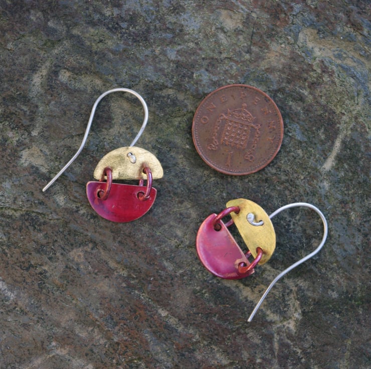Copper and brass hinged semi circles; joined with copper jump rings . The copper has been treated with heat to produce sumptuous red tones on the smooth surface . There is some raw copper areas too. The top semi circle is made from brass sheet and I have given it a matt/frosted surface to contrast with the copper bits. They hang from sterling silver handmade earhooksand are able to move about and catch the light.