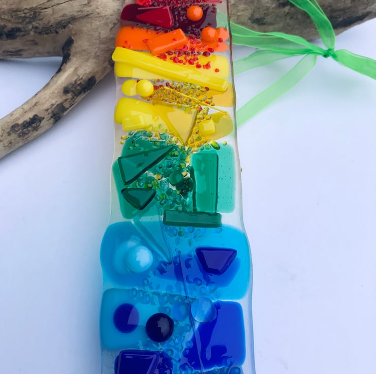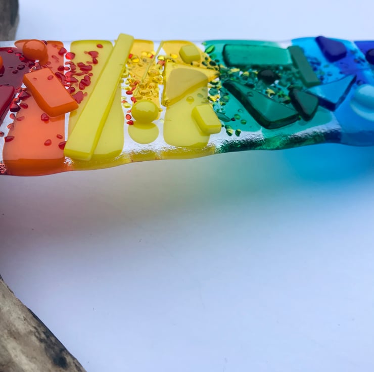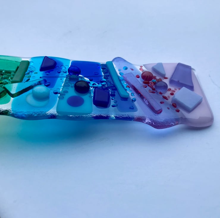 This suncatcher is made by me from hand cut glass. The first layer is clear glass on which I place smaller pieces of coloured glass I then fully fuse. Once out the kiln and cooled I then add another layer of glass pieces, as well as frit and coloured glass balls these are the tack fused to give texture to the piece.