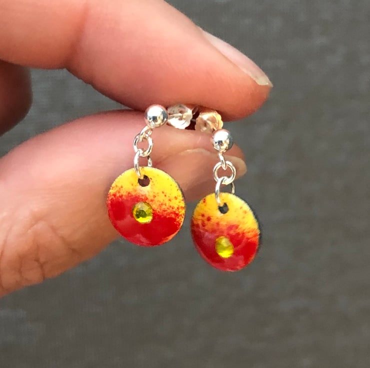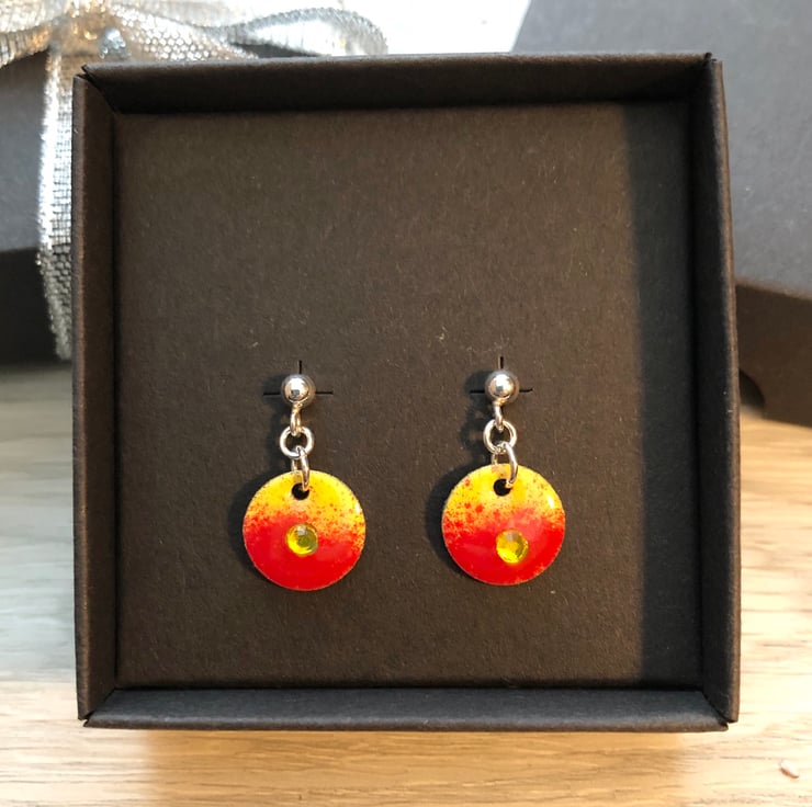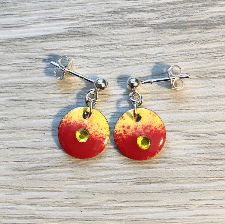 10mm stainless steel discs have been hand enamelled using the cold enamel technique. A crystal has been added to the middle and secured using clear enamel.