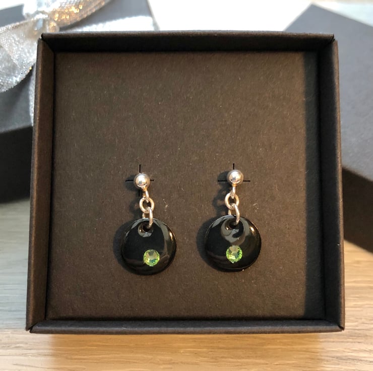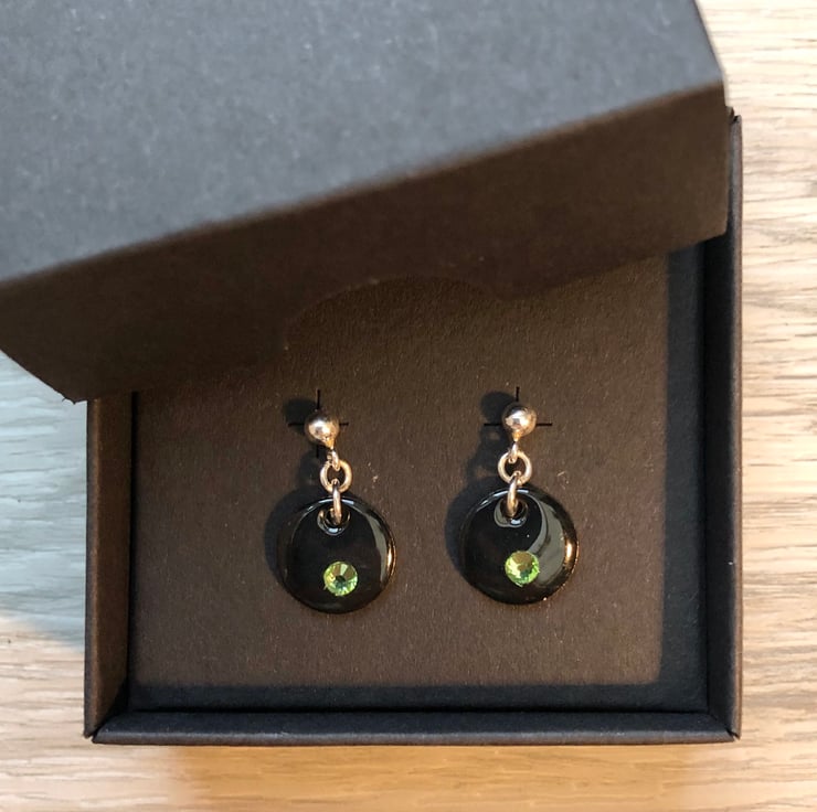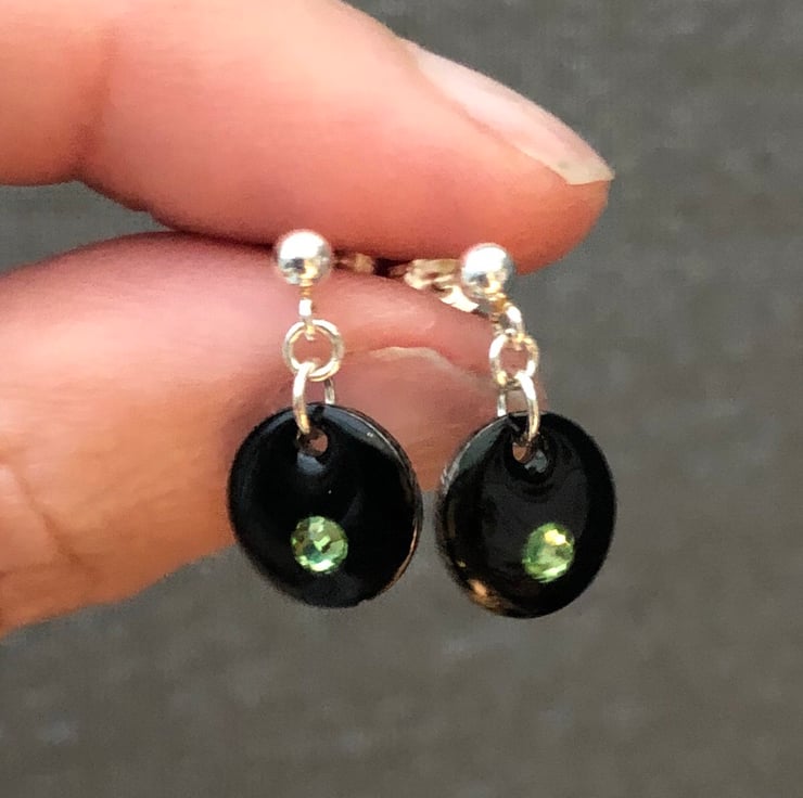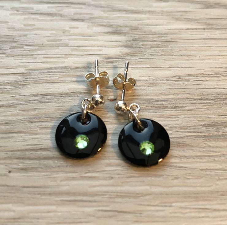 10mm stainless steel discs have been hand enamelled using the cold enamel technique. A crystal has been added to the middle and secured using clear enamel.